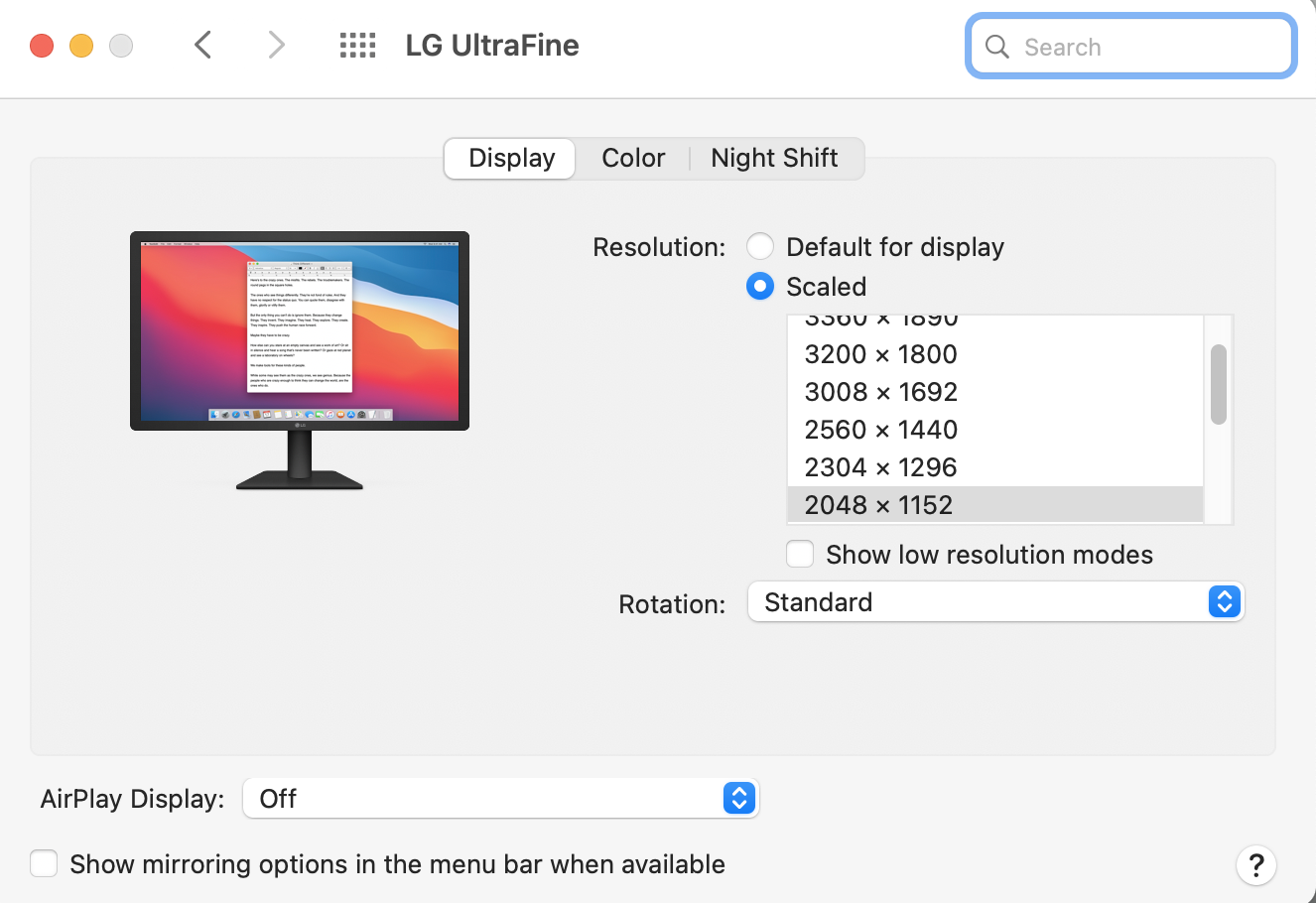 With Mac OS on my 2018 Mac Mini I notice instead of changing the resolution, it just scales it down if I choose anything but the native resolution of 4K. How do I actually change the resolution and not just Scale it? When scaling the performance of the computer is drastically affected. I tried holding the Option key down when hitting the scaled option which presents me with a list of resolutions but those still scale. You can notice when you drag a window there is significant lag and it's not buttery smooth.