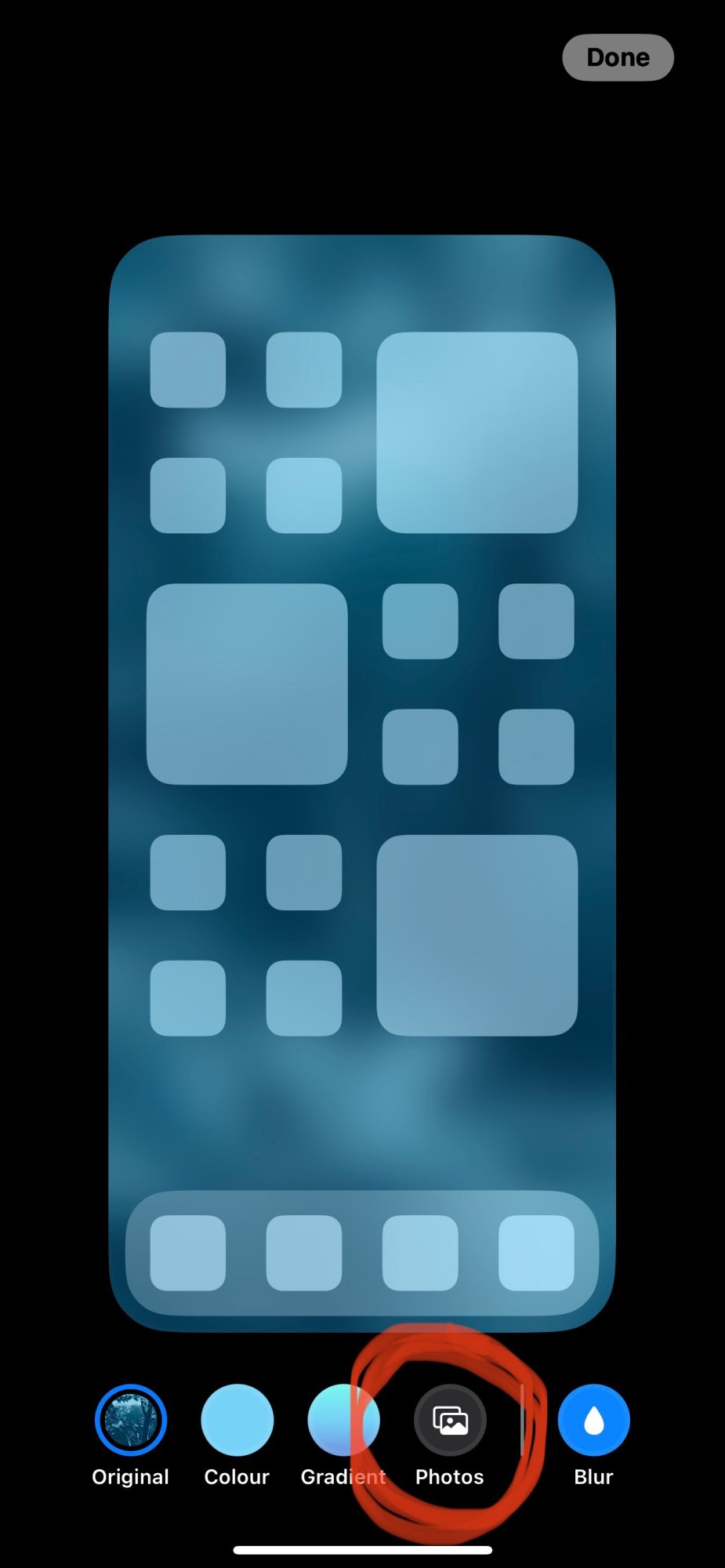 Next you need to pick "Photos" in the little circle at the bottom. Like I said previously, you cannot choose a photo from the Apple Gallery, only from your own photo library