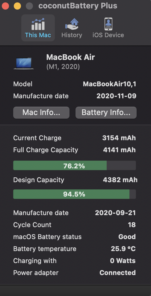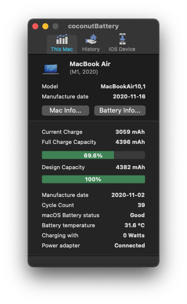Also glad to report that after 39 cycles and 3 months the Air is still holding steady at 100% battery health. It went down to 98% at some point, but with AlDente and better charging habits, it consistently returns to a few mAh above the Design Capacity.