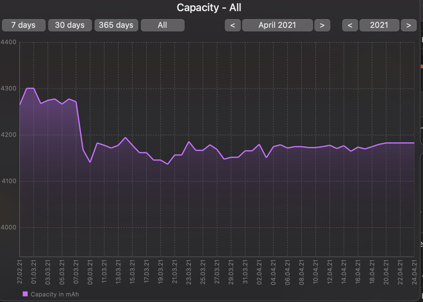 The drop in capacity seems to have been a very sudden event on March 7th, not a gradual process. I was not aware of anything on March 7th to draw my attention. I only discovered later. Here is my Capacity history from Better Battery 2: