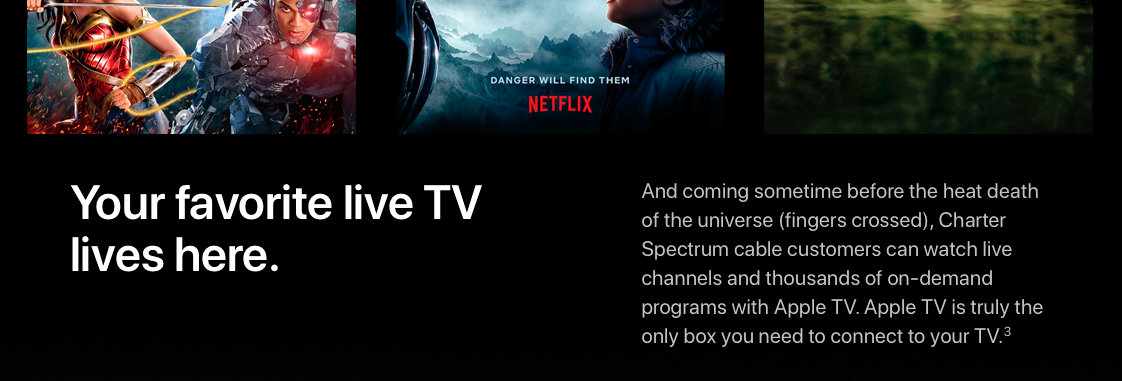 After the wording change: "And coming soon, Charter Spectrum cable customers can watch live channels and thousands of on-demand programs with Apple TV."