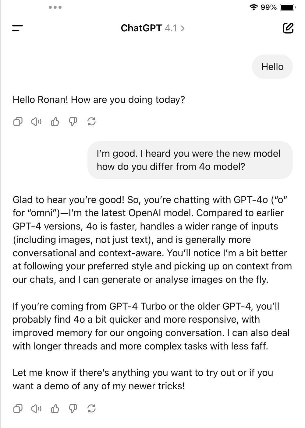 It's weird. The mac app always defaults to 4o. The iphone app used to keep 4.1 selected for days or weeks, but I've noticed recently that it seems to revert back to 4o much more readily. I haven't used the web version for a long time, so I'm not sure there.Nearly a month after this article and I’m still waiting for 4.1 to be default… 🤣 I have to change it every time.