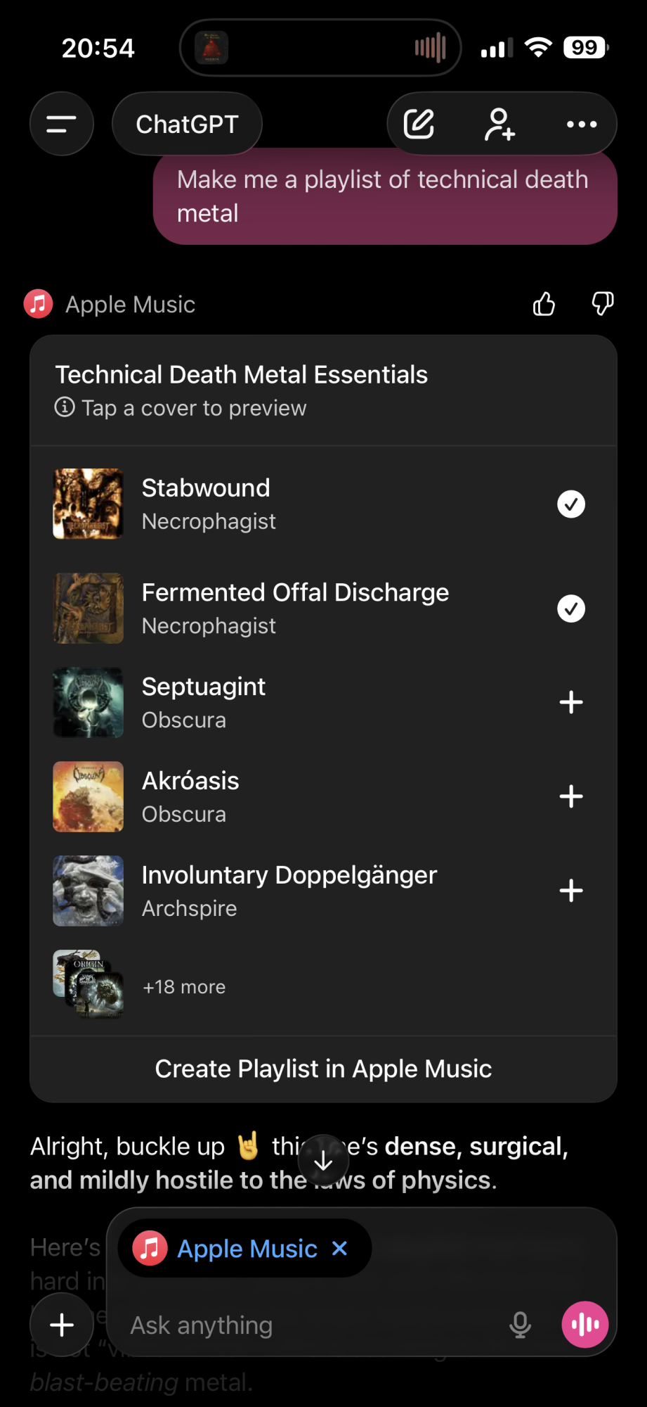 The only point of the integration seems to be to let ChatGPT make a song/album recommendation or create a playlist based on your prompt. You can add those directly from ChatGPT to the Apple Music library, though, it just requires an additional button press…I asked ChatGPT what good it does to connect Apple Music to it and it said “not much” View attachment 2589889