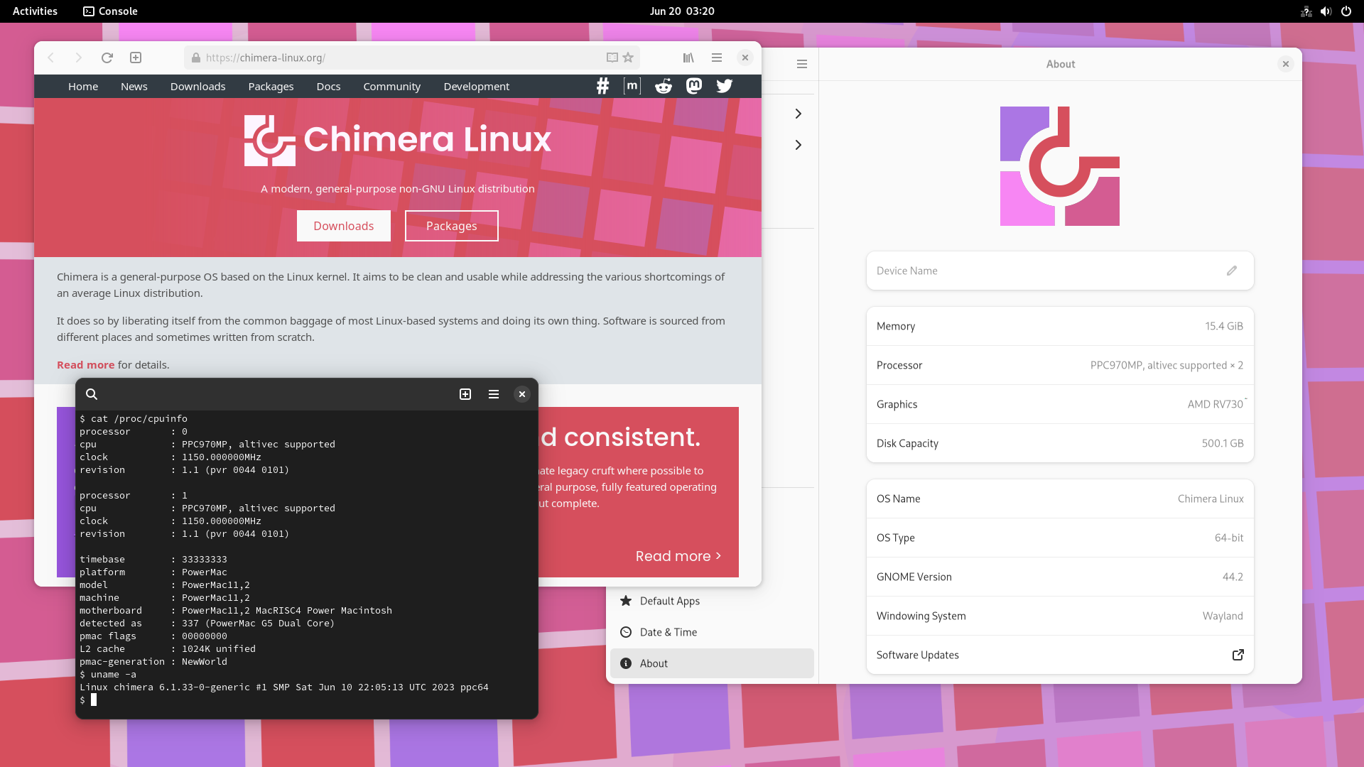 Attached: 1 image first experimental big endian #powerpc #ppc64 iso is available: https://repo.chimera-linux.org/live/testing/chimera-linux-ppc64-LIVE-20230620-gnome.iso here is it running from usb on my 2005 #powermac g5 keep in mind it's a tier 3 architecture, so don't expect perfection