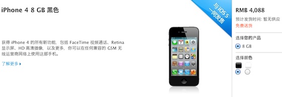 The 8 GB iPhone 4 is currently listed as the only iPhone 4 option in Apple's Chinese online store, but the device is not yet available for purchase through the site.