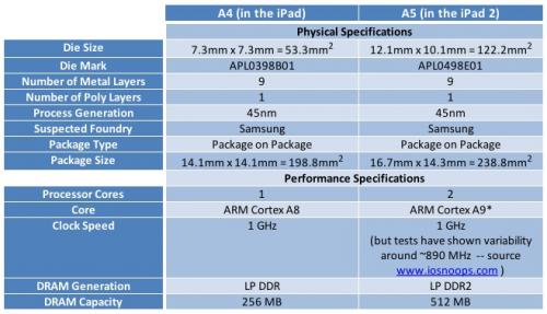 Chipworks has also performed a decap of the A5, similarly revealing that the package is being manufactured by Samsung.At this scale even electron microscopes start to run out of steam, so not the clearest of images in either case, but good enough to see the similar shape of the transistor gates and the dielectric layers. So at least this sample of the A5 is fabbed by Samsung, just as all Apple's processor chips have been for the last while.Also of interest, iOSnoops discovered that the while the A4 chip found in the original iPad clocked in at a consistent 1 GHz, each of the two cores in the new A5 seems to run at a variable speed between 861 MHz and 894 MHz depending on the app being run, suggesting that Apple has built in more advanced power management features for the A5.