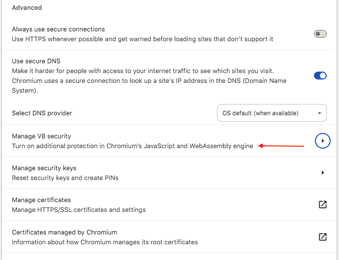 For security reasons, I highly recommend everyone go into chrome://settings/content/v8 and select "Don’t allow sites to use the V8 optimizer". (This is Chromium's JIT compiler, for those who know what that means).