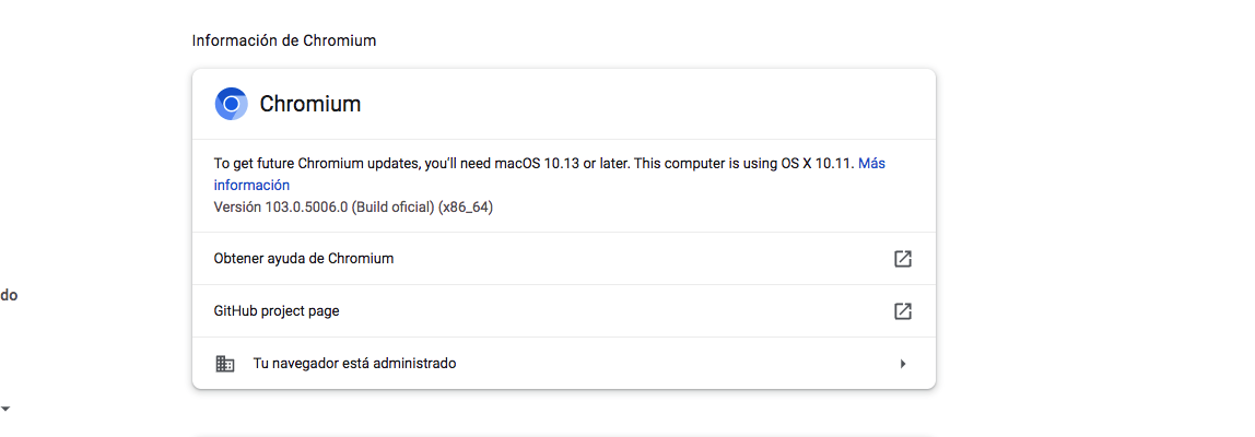 It seems that this 103 is the latest version of Chromium. Now I get the message that to use Chromium I must go to OSX 10.13. If I go to the Giturb page, Bluebox announces a new branch. This is strange, since I have 10.10 Yosemite