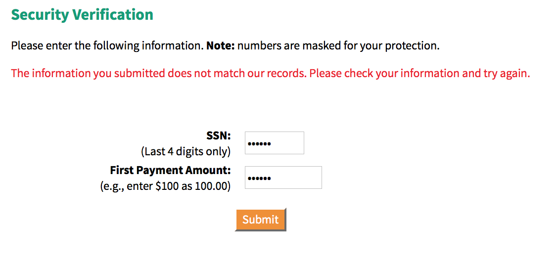 I've tried using my old log in as well as signing up with the new loan number but I get errors. It asks me for the last 4 of my SSN and the amount of my first payment but it says my information does not match. The amount of the first payment is $114.50 and printed on the receipt and I'm quite confident I know the last 4 of my SSN.