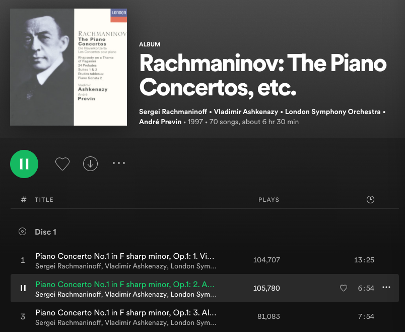 While my (late) father loved Rachmaninov's Piano Concerto No 1, he absolutely adored Rachmaninov's Piano Concerto No 2 (as do I), and loved to listen to it.The first 3 are on available on Spotify - added them to my "Suggested by MacRumors - Playlist" - 👍