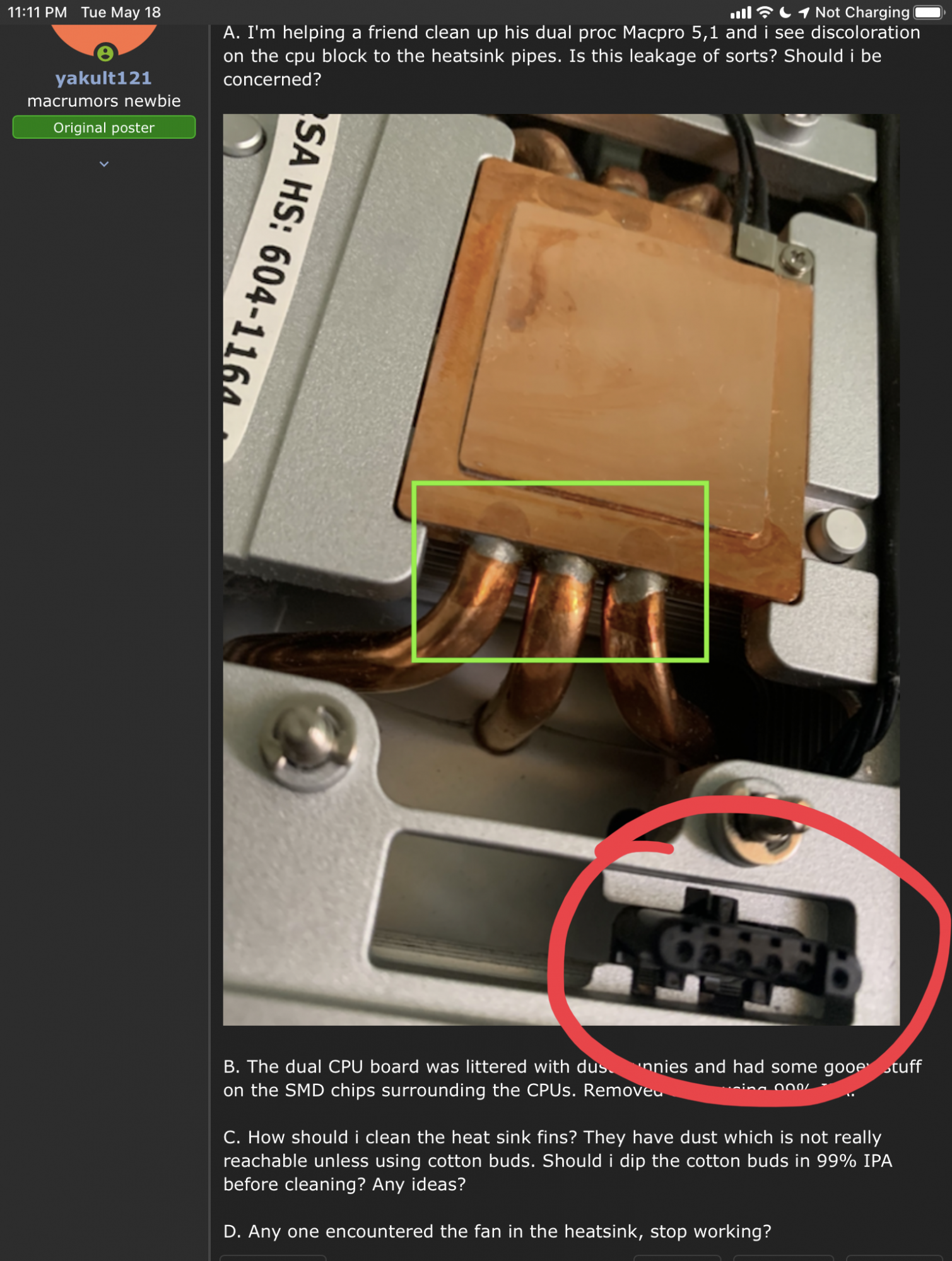 A. I'm helping a friend clean up his dual proc Macpro 5,1 and i see discoloration on the cpu block to the heatsink pipes. Is this leakage of sorts? Should i be concerned?