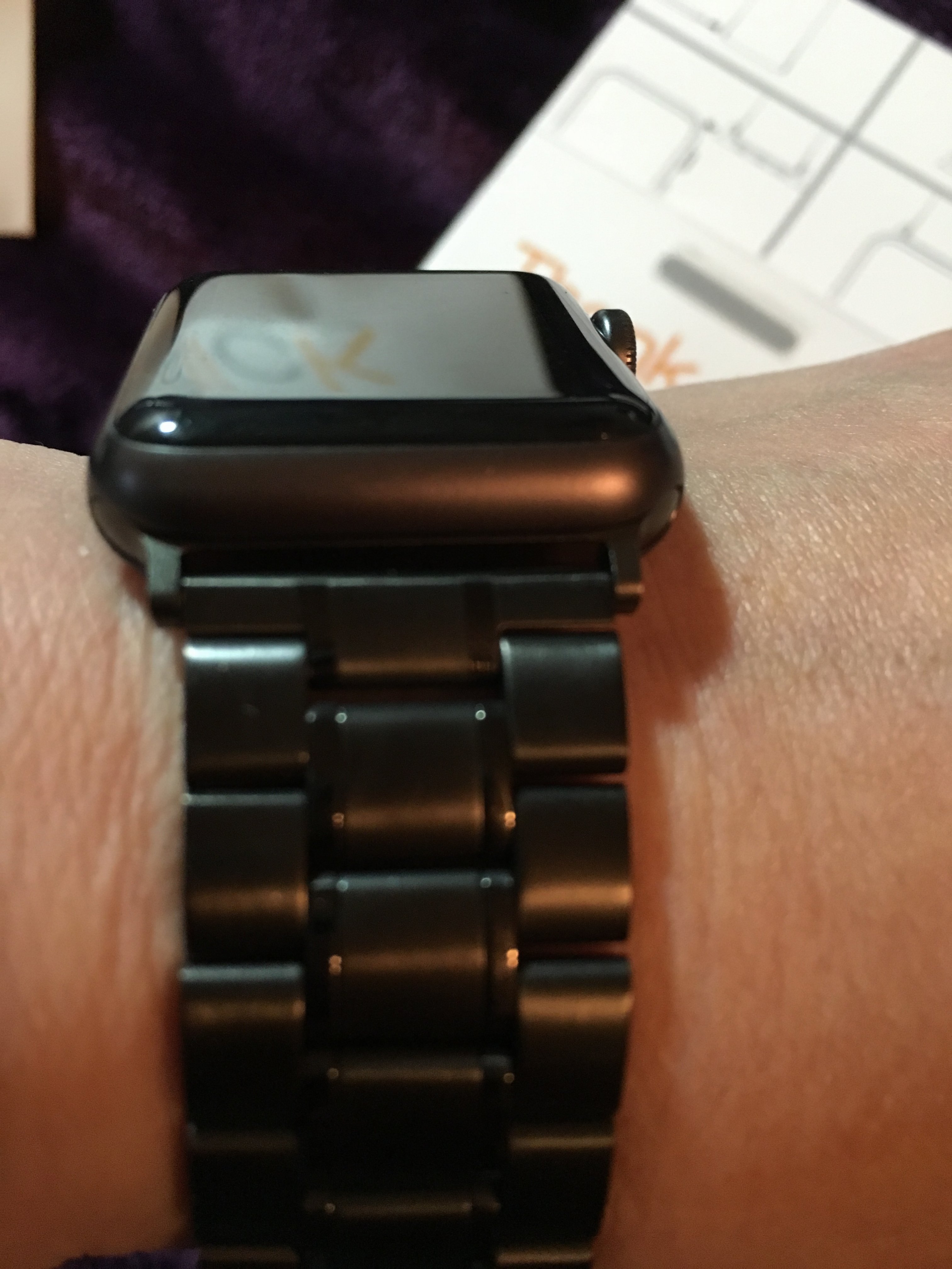 Since wearing it for a while after assembling things, I've noticed a slight reflection coming off the edge of the adapter where it protrudes from the slot in the watch. This is disappointing. Now, keep in mind, in the last picture (the one after the collage), that this is very much a closeup, with a very bright light shining at just the right angle to make it look as bad as possible (showing up as the bright line across the middle of the picture). If the body of the adapter were just a fraction of a millimeter thicker, it could have fit perfectly. I expect this could be the result of a safety factor (better to have it just a touch too thin than a touch too thick and then not fit at all), if their manufacturing partners can't hit quite close enough on the tolerances. (This is where Apple totally wins, in general, on manufacturing tolerances, by having full-time on-site staff to keep an eye on tolerances and quality all the way through the process, vs. visiting occasionally, and also by investing time and personnel in custom making tooling to meet their needs as necessary, vs. using what's available).