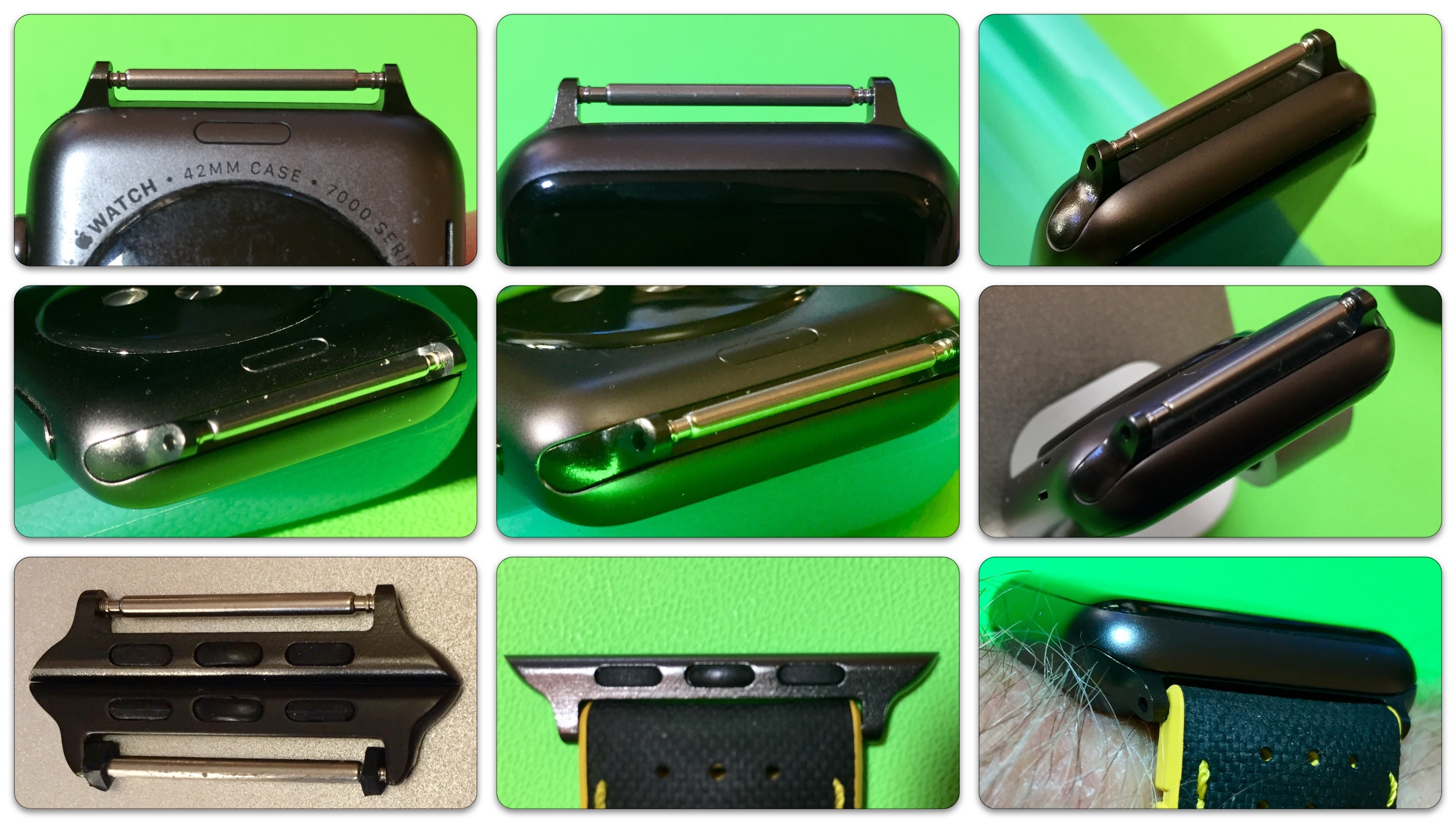 Since wearing it for a while after assembling things, I've noticed a slight reflection coming off the edge of the adapter where it protrudes from the slot in the watch. This is disappointing. Now, keep in mind, in the last picture (the one after the collage), that this is very much a closeup, with a very bright light shining at just the right angle to make it look as bad as possible (showing up as the bright line across the middle of the picture). If the body of the adapter were just a fraction of a millimeter thicker, it could have fit perfectly. I expect this could be the result of a safety factor (better to have it just a touch too thin than a touch too thick and then not fit at all), if their manufacturing partners can't hit quite close enough on the tolerances. (This is where Apple totally wins, in general, on manufacturing tolerances, by having full-time on-site staff to keep an eye on tolerances and quality all the way through the process, vs. visiting occasionally, and also by investing time and personnel in custom making tooling to meet their needs as necessary, vs. using what's available).