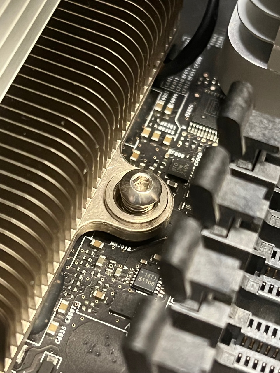 As you can see, the fix is permanent, trouble-proof, easy to disassemble/reassemble, if necessary, and elegant. The next illustration shows the nuts under the PCB in the assembled CPU tray; as can be seen, the 14mm screw length results in full engagement of the nylon locking insert with a minimum of protruding thread and plenty of clearance between the screws and the tray itself.