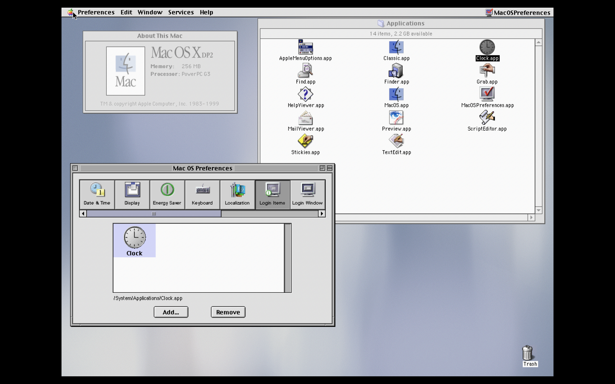 That's awesome. Thanks for pointing that outWell, what do you know? It turns out Mac OS X DP2 did have a Clock.app, but that didn't survive to 10.0 (Cheetah). For a quick throwback, here's a screenshot. Clock.app doesn't actually open anything per se, but it does have a preferences menu to select settings, etc. I assume this was a remanent application from NeXT.