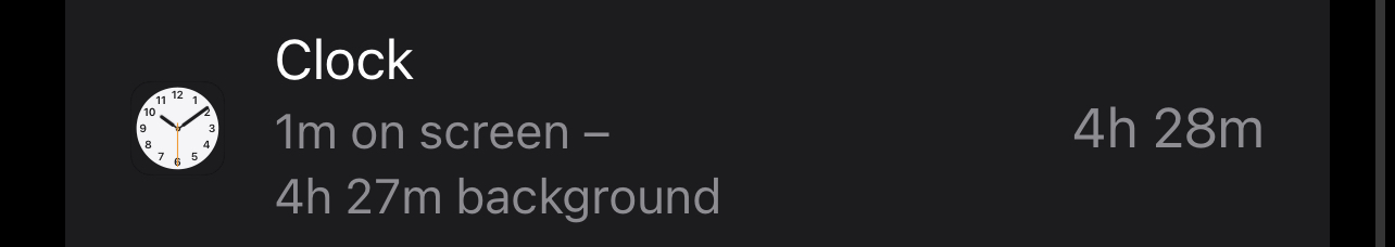 Ever since iOS 15.2 or 15.3 I believe I've been encountering random spikes of background usage for the default Clock app. It's not particularly connected to anything, since I usually have a single alarm scheduled (the one from Sleep Schedule) and I don't have any timers ongoing or anything that could justify it. I usually don't have the app open and ever since I've noticed it I've been a lot more careful about swiping the Clock app away/closing it, without any noticeable effect.