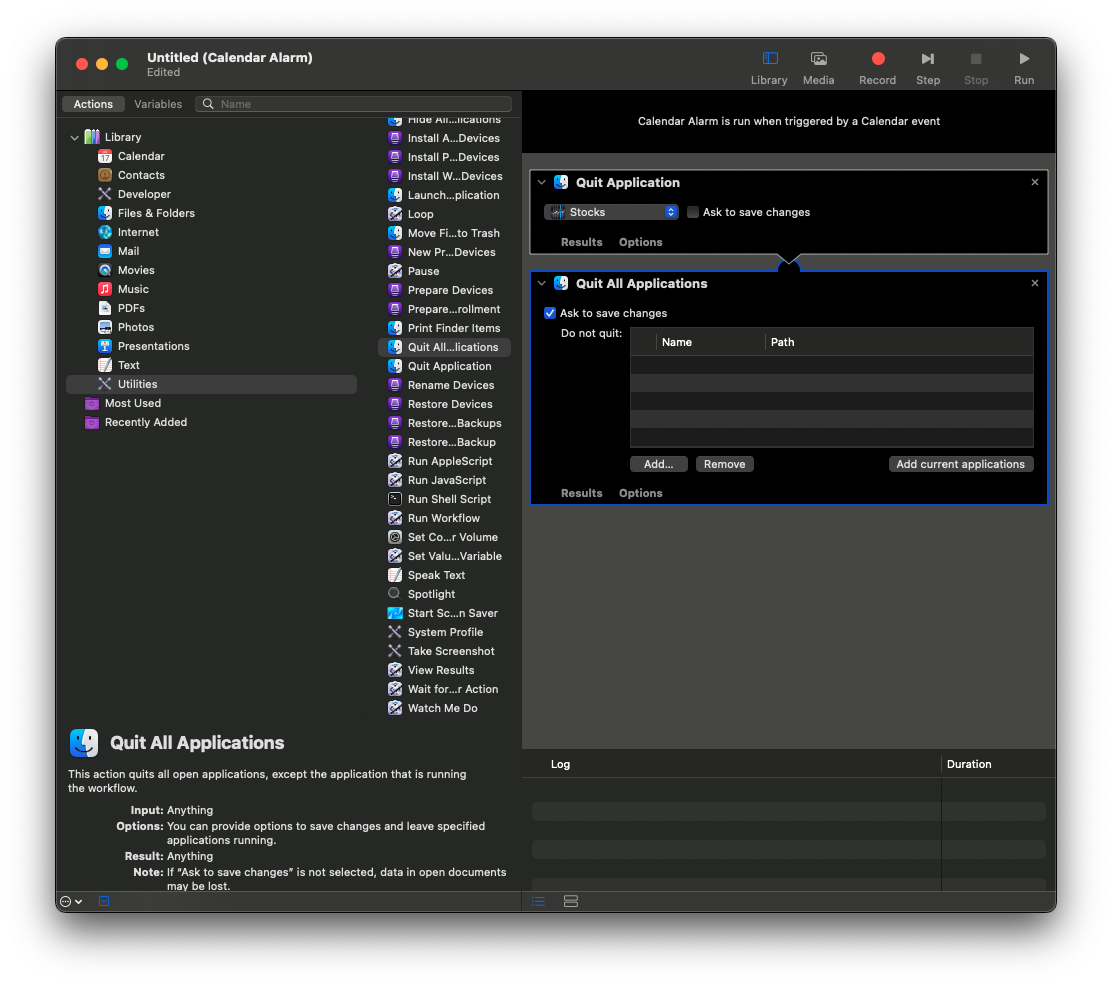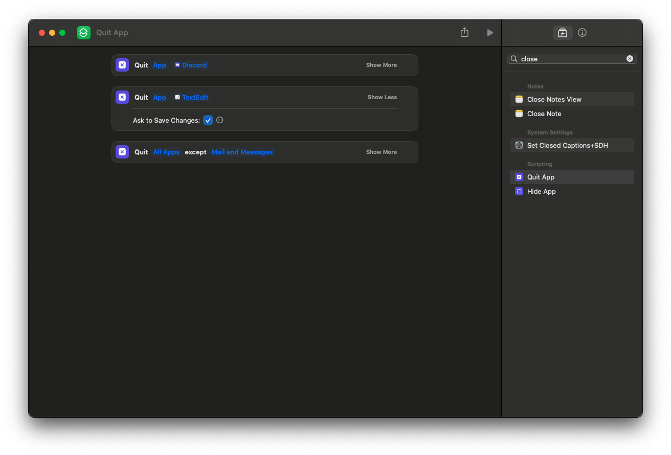 I have Automator automatically open certain applications at a certain time in the evening. The next morning the windows are open. I would like to avoid having to close them by hand with cmd-w, I want Automator to do that for me automatically after opening the apps. Automator can open Apple Script, but what do I enter next?