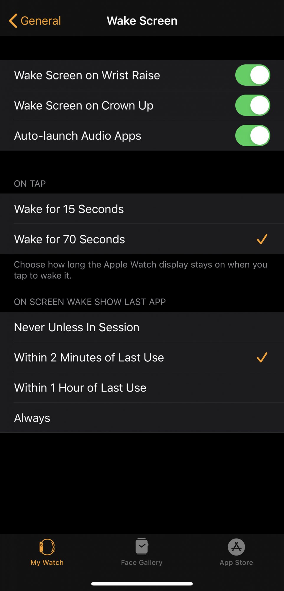 What I believe you’re looking for is in the watch app under settings>general >wake screen>never unless in session