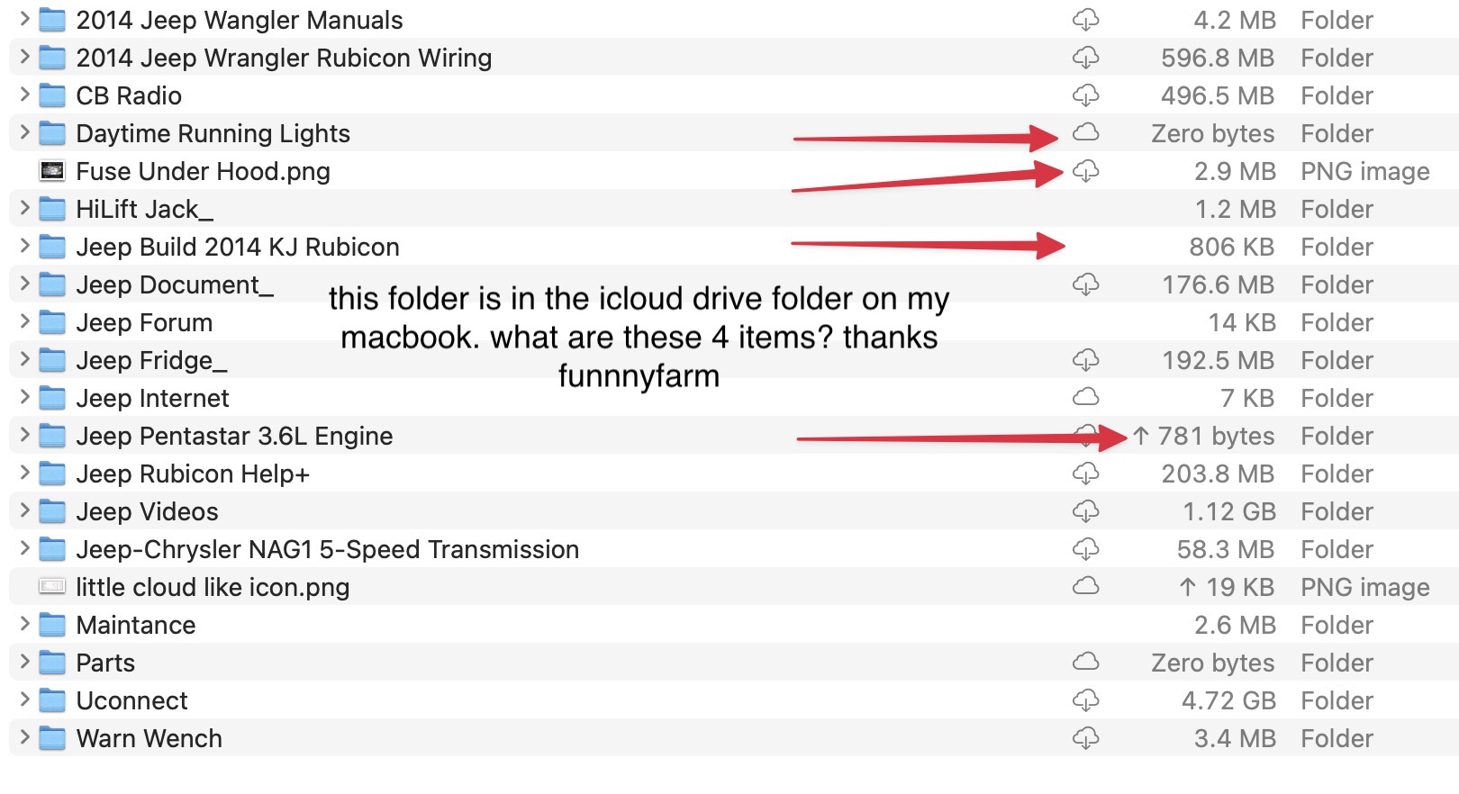 I recently started backing up my MacBook on the cloud. I don't quite understand what the 4 things are indicating. I looked in the internet but only found that the cloud with the arrow down means, the file is in the cloud not on the Mac. to get it I should click on it and it will download on my Mac.Thanks funnnyfarm