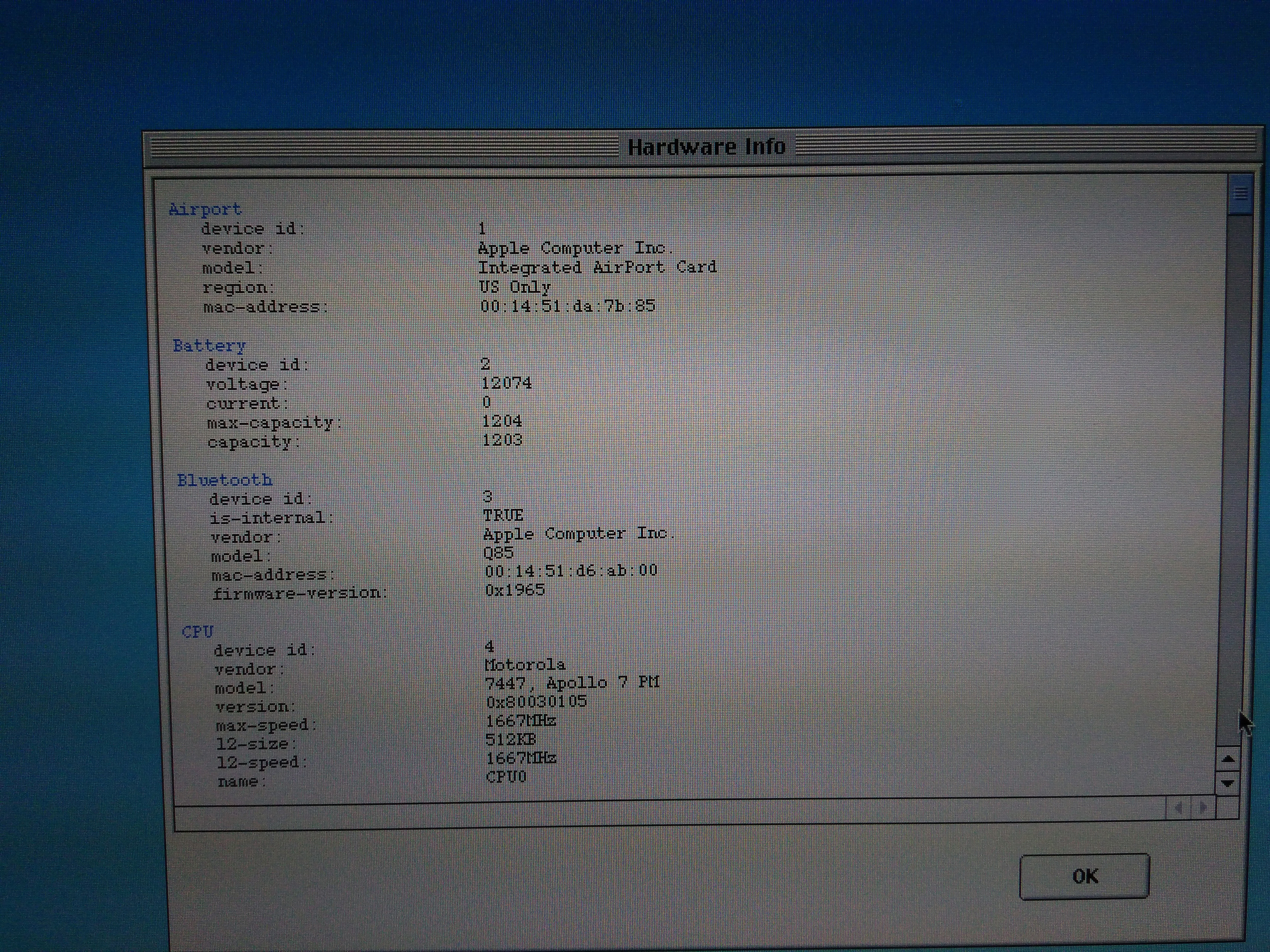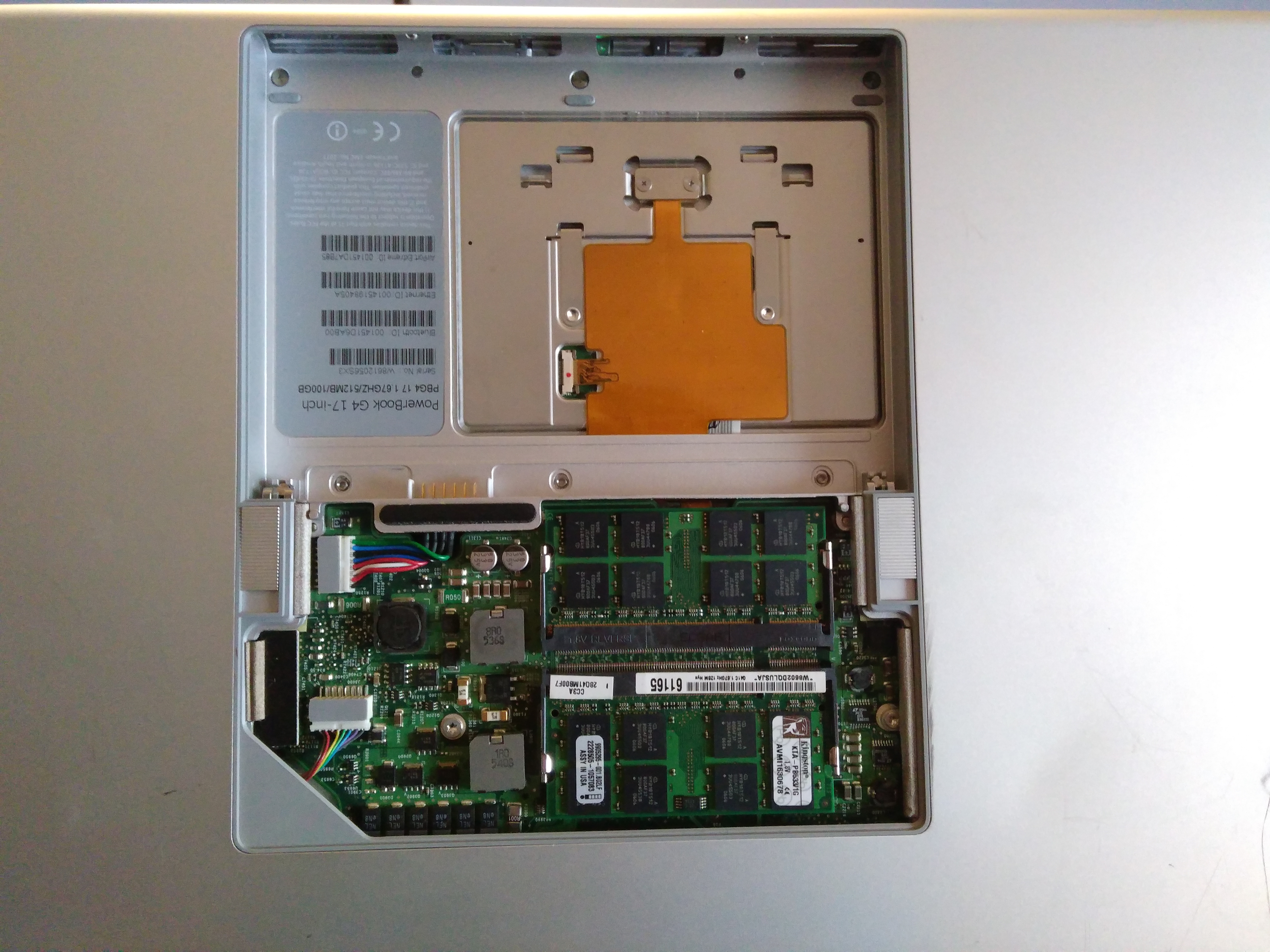 The best news of all, though, is this: I opened up the computer when I got it, because of course it needed some fresh thermal paste, and I wanted to replace the spinner drive with a new Crucial 500 GB SSD. When I removed the top case - queue angels singing - I was greeted by an absolutely pristine, theretofore untouched logic board. All of the yellow tape installed at the factory was present and undisturbed, with no fingerprints. The hard drive was original equipment with Apple logo. It was clear that no one had been inside this machine since it left the factory, and - get this! - it. was. CLEAN!!! I mean, no corrosion, no dirt, hair, dead bugs or other contaminants of any kind. There was only the slightest bit of dust present on the heat sinks, which of course for a 13-year-old computer is unavoidable. It was then I knew what I had: this machine had clearly only ever been used inside a climate-controlled facility, and probably not much at that. I have never before seen a used computer in such exceptional interior condition. As such, I have every reason to expect years of good service from my new companion.
