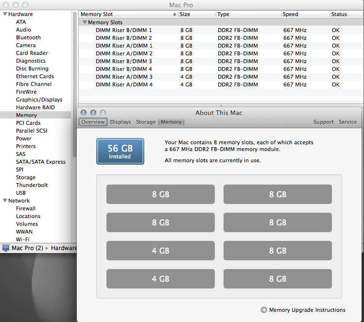 By the way - if you wish to utilize the maximum memory performance using 56GB (6x 8GB and 2x 4GB) in the 3,1, install the 2x 4GB modules in memory slots A3/A4 on Riser A as Riser B should be maxed out with the 8GB sticks due to the fact that it is assigned branch 0 in the north bridge memory controller and Riser A is assigned branch 1 - see attached diagram and screenshot of system information/memory.