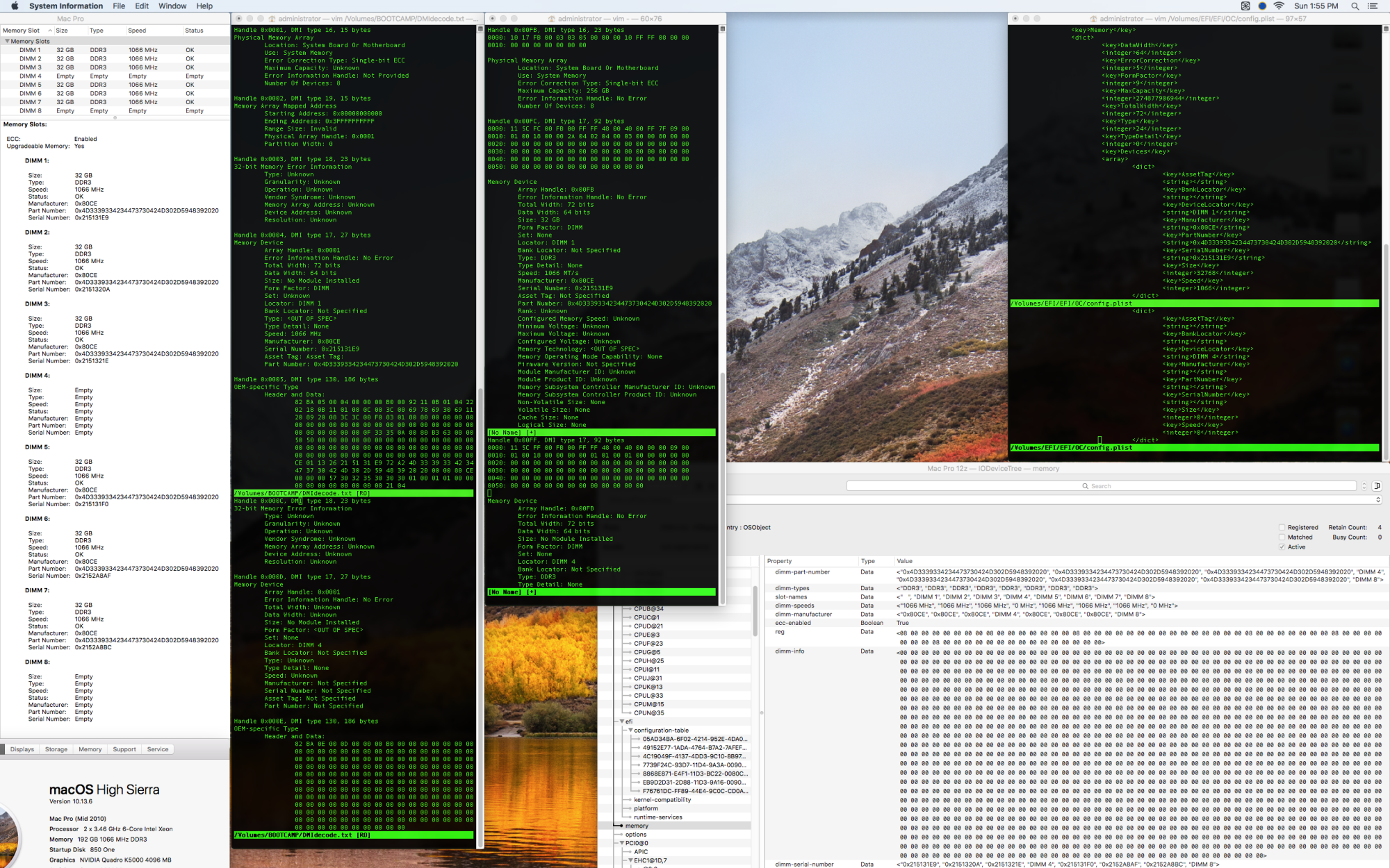 - Compared three outputs of dmidecode, as well as IORegistryExplorer's IODeviceTree:memory page and System Info