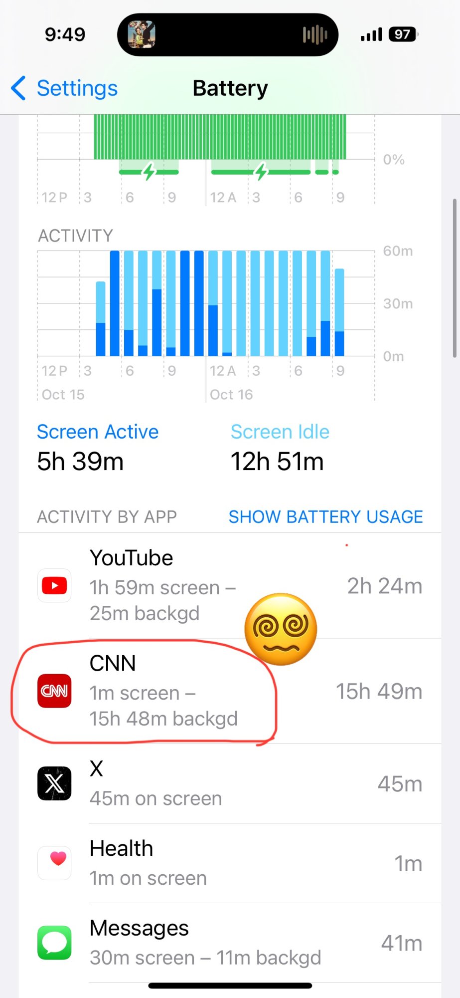 PSA: the CNN app is bugged and probably draining your battery. It’s draining mine. Check your battery usage. I’m gonna delete the app and see if battery improves. Yikes. Almost 16 hours in the background See: