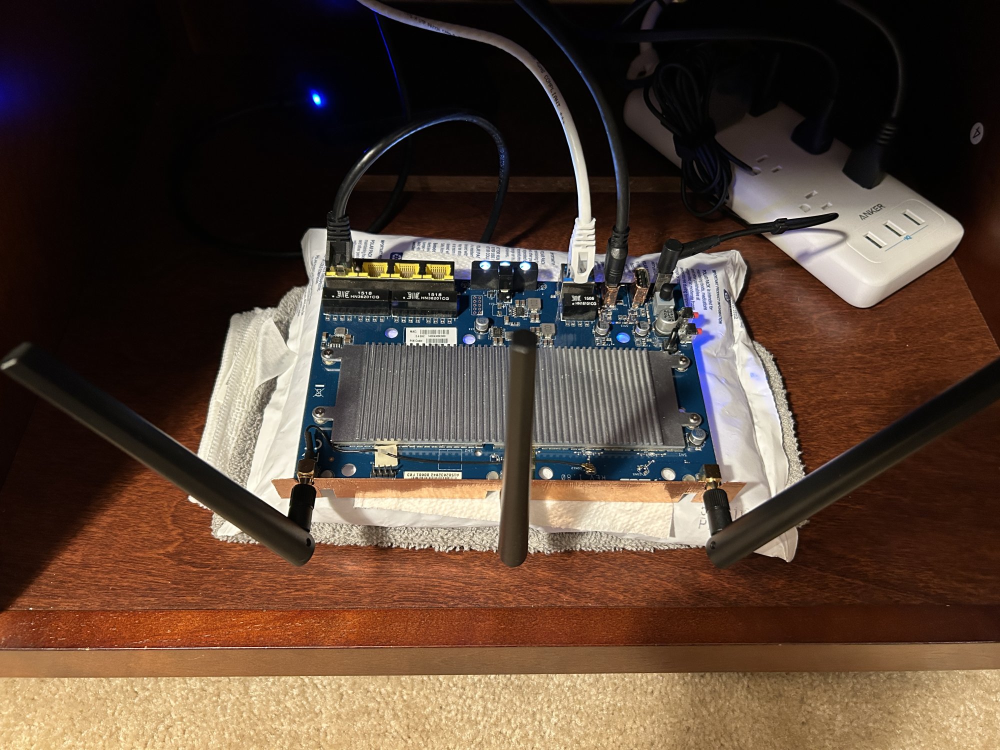 So I decided to take it a step further and cool down the entire PCB and the CPU. I have reusable thermal packs, so I placed the PCB on top of it flat, waited about 10 minutes and CPU temp dropped to 86F / 30C. Performed another transfer test of the same large file that is about 10GB, and the speeds plummeted down to 4MB/s, few seconds later it would shoot up to 20MB/s and drop to 10MB/s. The speeds were inconsistent the entire time while the routers CPU temp was hovering at around 31C / 88F degrees. I performed the test several times just to be sure it's not a fluke and results were still just as poor.