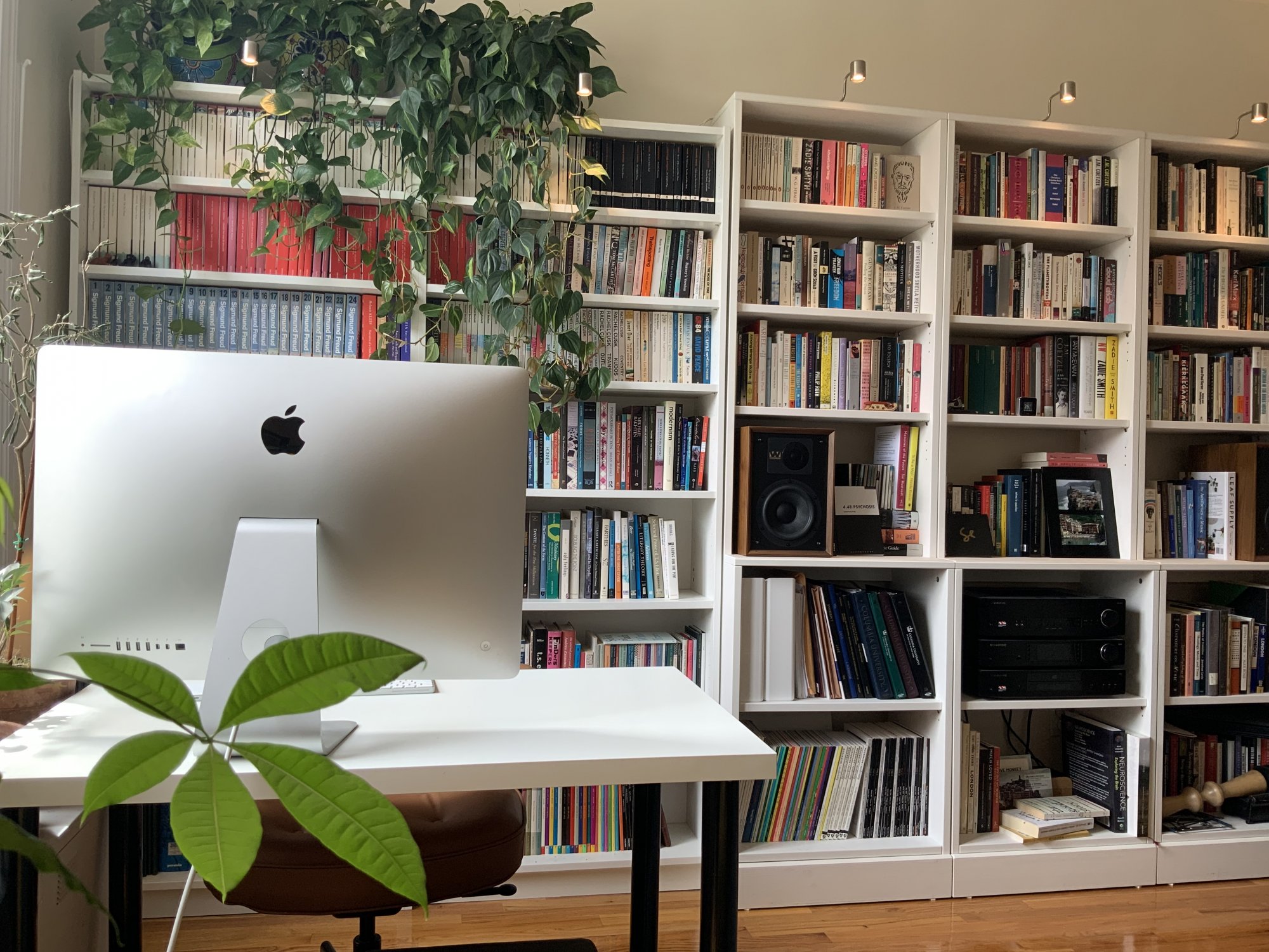 I like that vine work in the back! Nice office!My iMac sits by the window. This is what I see from my favorite armchair: