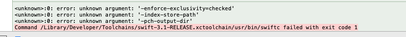 '"Command /Library/Developer/Toolchains/swift-3.1-RELEASE.xctoolchain/usr/bin/swiftc failed with exit code 1'