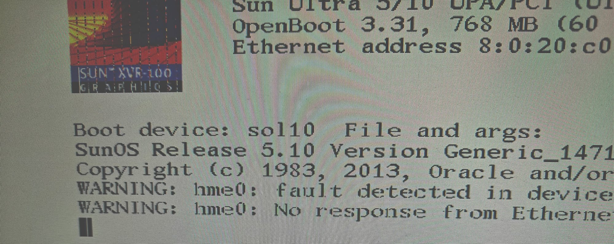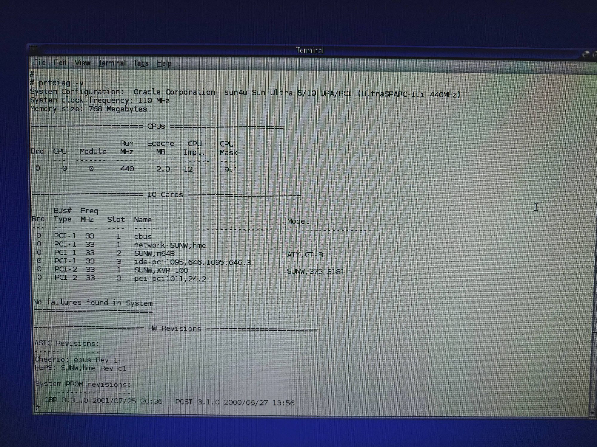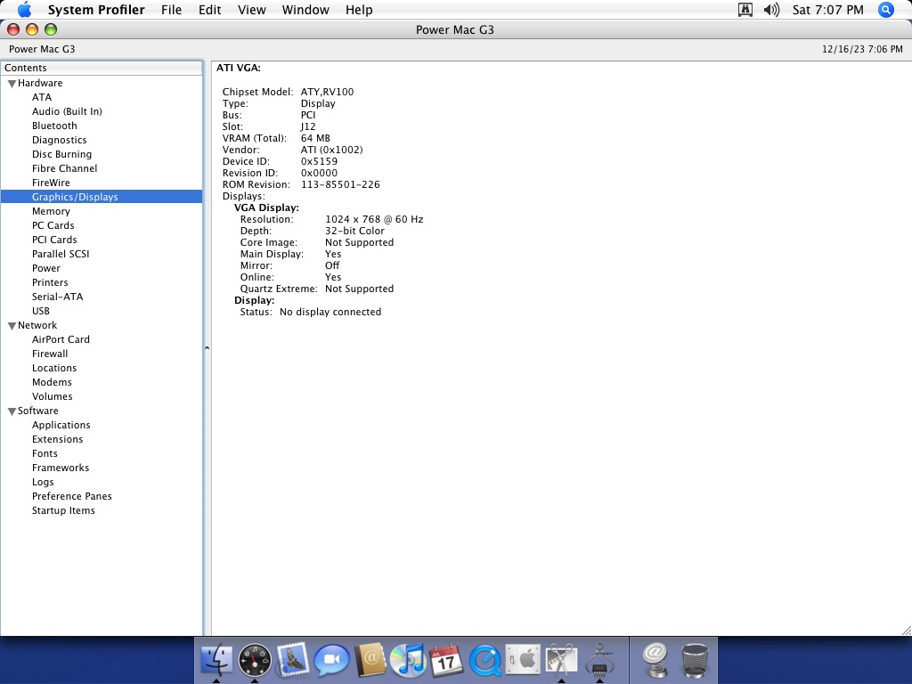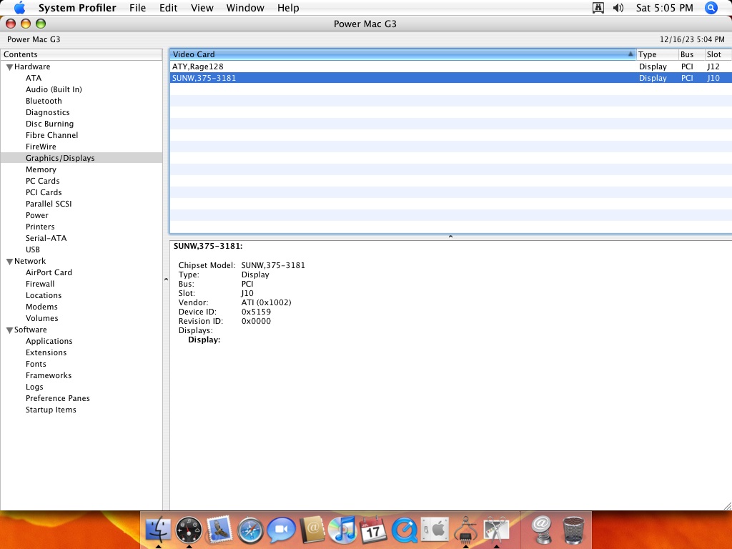 The boot screen showed up as usual, but in the OS itself the graphics were messy. I took a look at the Graphics/Displays information pane under System Profiler, and saw that the card was detected as "SUNW,375-3181", not "ATY,RV100", which is the Radeon 7000's identifier. The OS even got as far as detecting the connected display's resolution and color depth (the reported VRAM was wrong, though, as the card has 64 MB, not 128 MB).