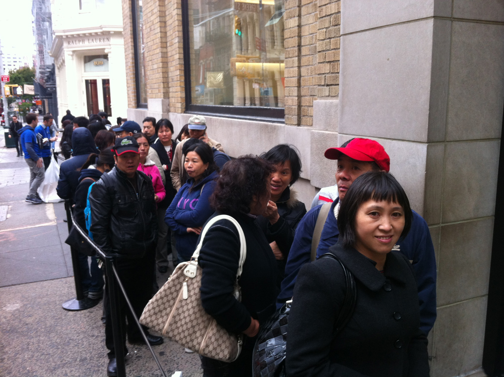 I decided this morning to get up at 5AM and go up to the 5th Avenue Apple Store in New York City. When I got there, there were 300 Chinese people waiting in line. I wondered if they were tourists. I asked the Apple Store employee how long the wait would be, he said at least two hours. Aside from 3 or 4 non-Chinese people at the front of the line, literally everyone in line was Chinese.