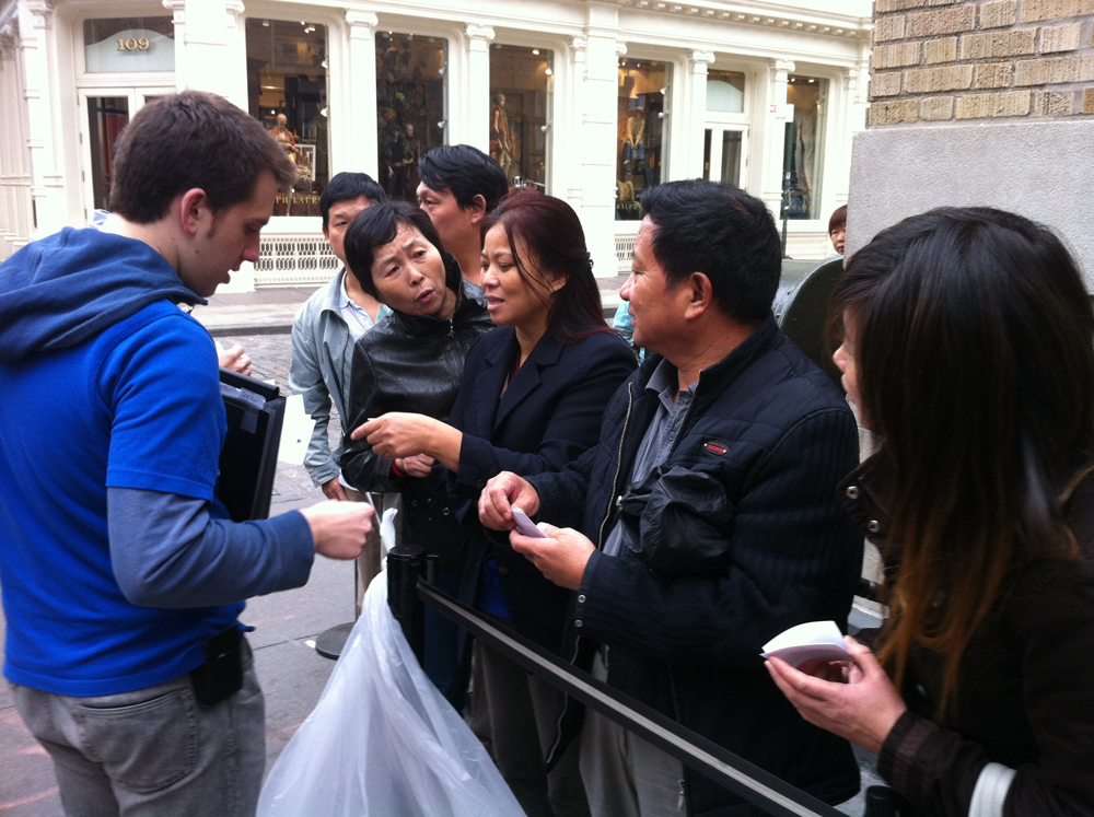 I called the Soho Apple Store and they said they had white 32 gig in stock. So I went down there, and what did I see? Check out the attached pictures - another couple hundred Chinese people waiting in line (mixed in with a few non-Chinese). This pretty much confirmed my suspicions that what I was witnessing was a concerted effort to send off-contract (basically unlocked) iPhones back to China to be sold at a profit. How much of a profit? One of the security guards at the Soho Apple Store said they could be getting 3 to 4 times the US retail sales price. -- This has got to be a first in China/US economic relations!