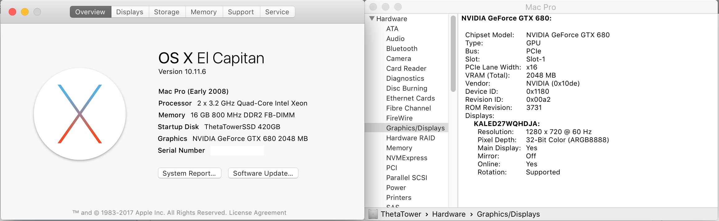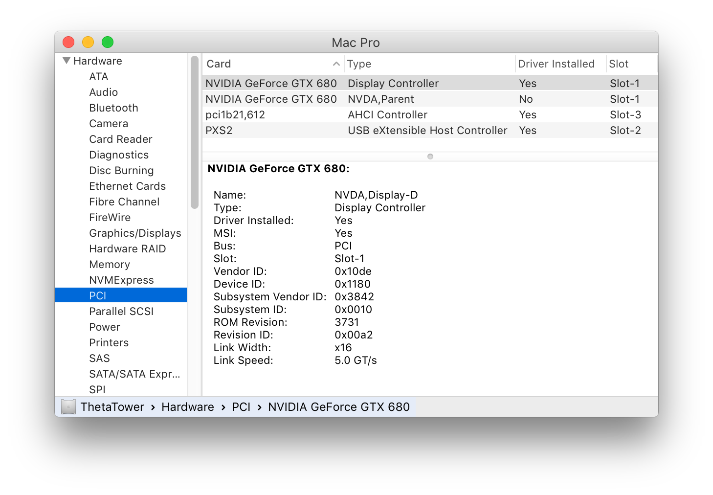 Mac Pro 3,1 (Slot 1) running Mac OS X El Capitan 10.11.6 using either Apple's driver or the latest NVIDIA Web Driver (10.11.14 (346.03.15f07)) + CUDA drivers (8.0.71). Full PCIe 2.0 link speed confirmed in Windows 10 (Bootcamp).