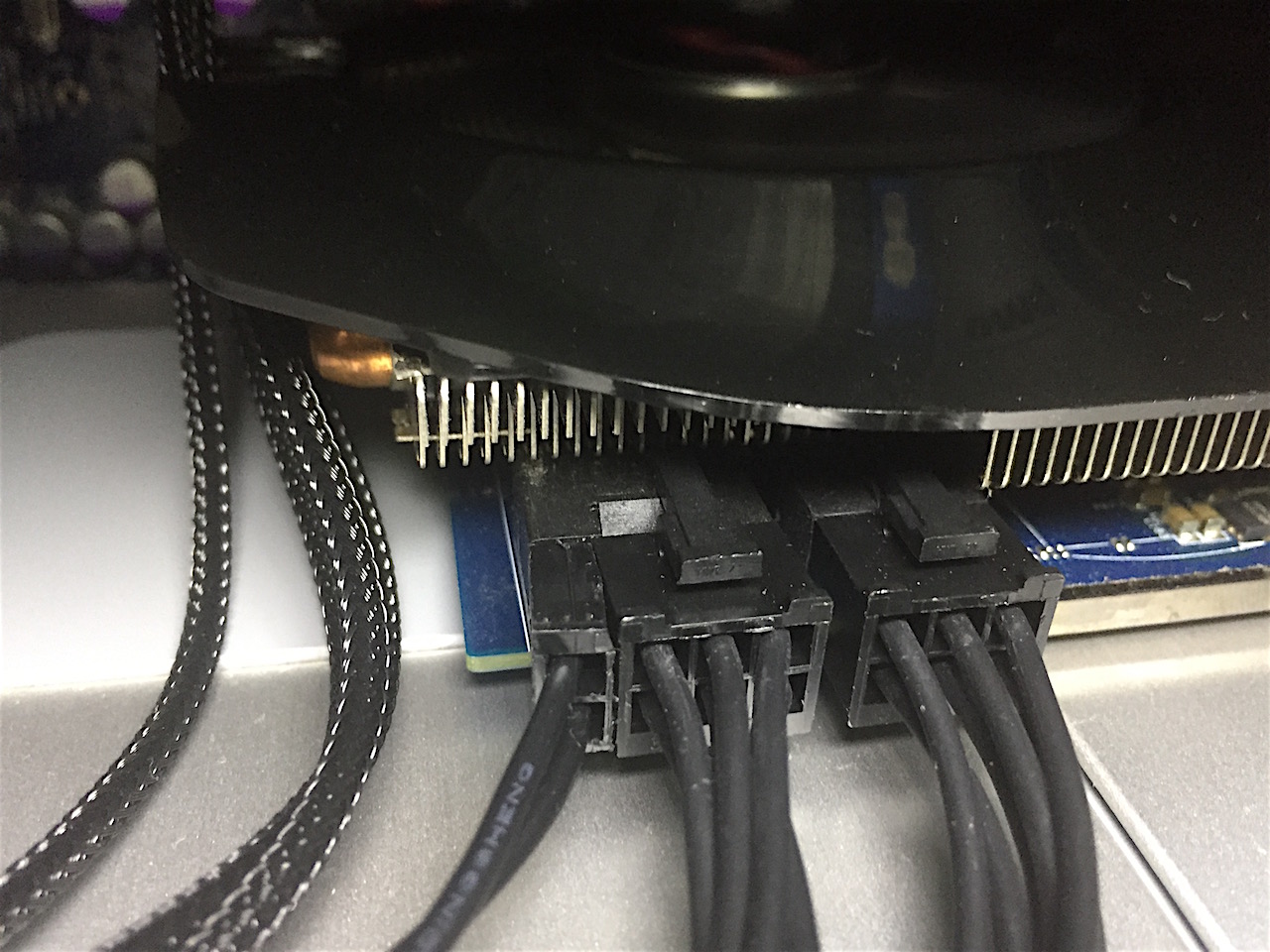 I pulled out the multimeter to test voltage at the two logic board PCIe power lines. Both cables tested 12.2v across their three pairs. I then began a series of trial and error attempts by shuffling PCI ports and power plugs, removing my other PCIe cards (USB3.1 and SATA III) and removing other devices (optical drives and hard drives) to try reducing power requirement in case it was a power supply issue.