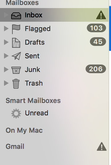 I never had any issues with Mail until recently. I have the app constantly open on a separate space. 50% of the times I check it, it shows an exclamation mark in the sidebar, like this: