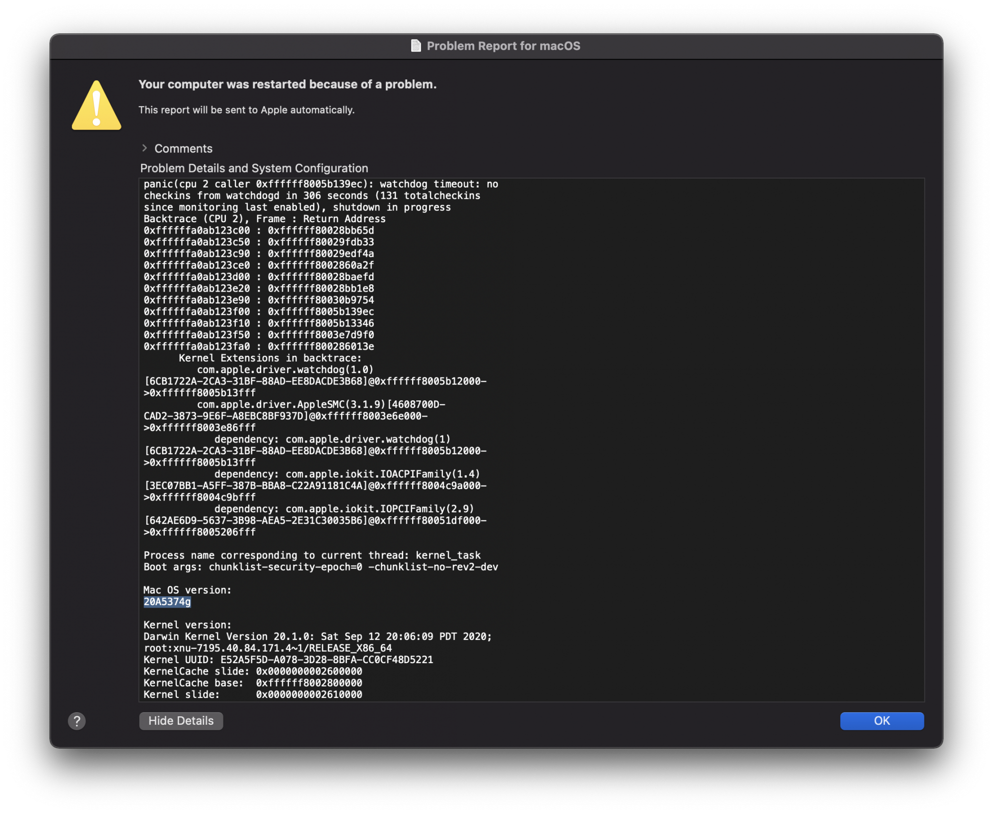 dependency: com.apple.driver.watchdog(1)[6CB1722A-2CA3-31BF-88AD-EE8DACDE3B68]@0xffffff8021b12000->0xffffff8021b13fff