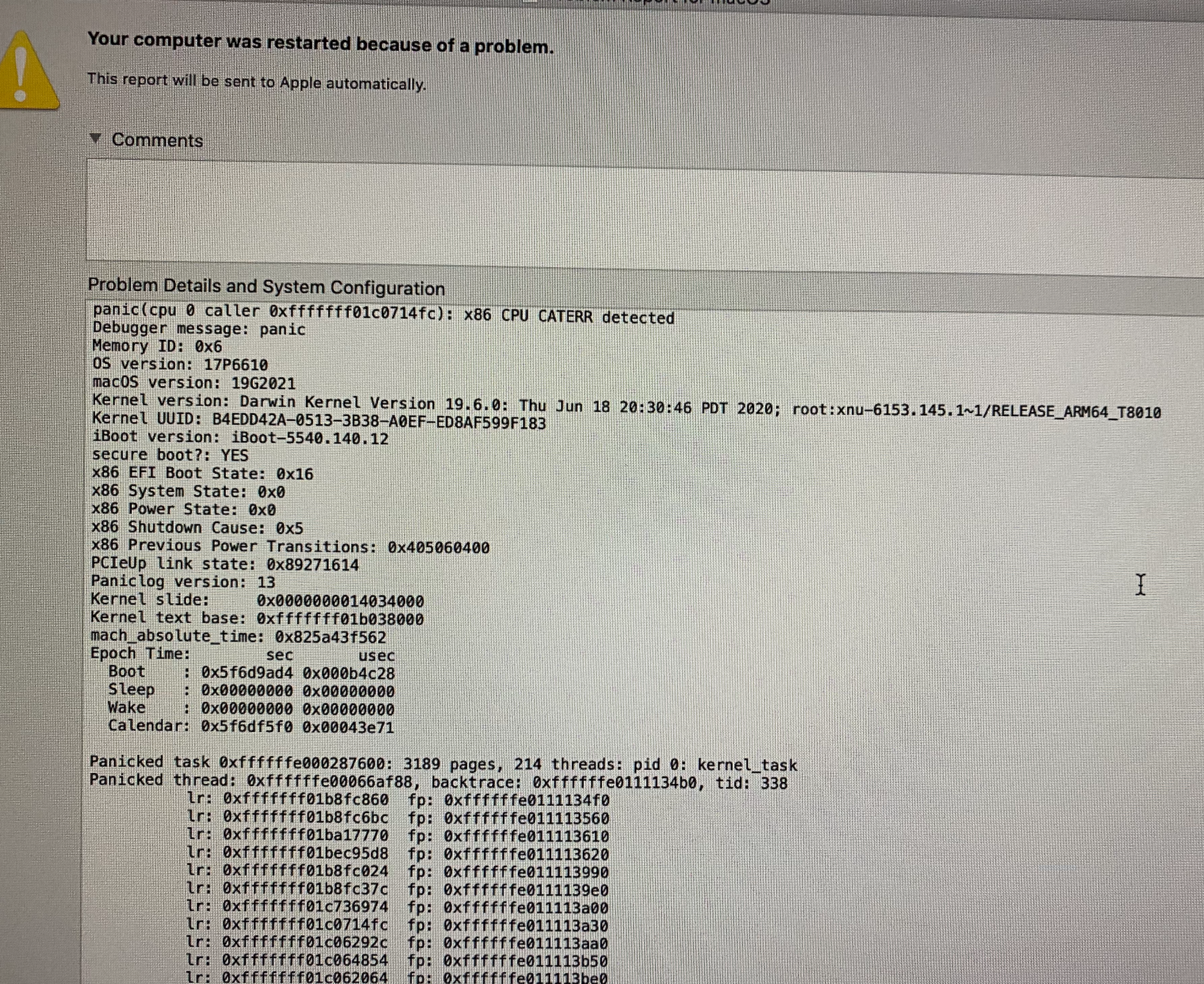 I then started the download of 10.15.7 and left the machine; guess what: it KP'd before it had finished downloading the update when it was unattended. However, this KP was also not from watchdog oder WindowServer, instead it read something about "x86 CPU CATERR detected" - this report is also not present in Console, but luckily I took a photo of it (see below).