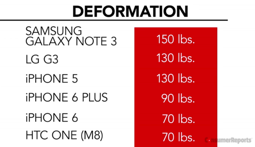 As a result of Apple's flawed design (under a test that doesn't even exploit the weak discontinuity at the volume buttons), the competition is about 150% more resistant to bending: