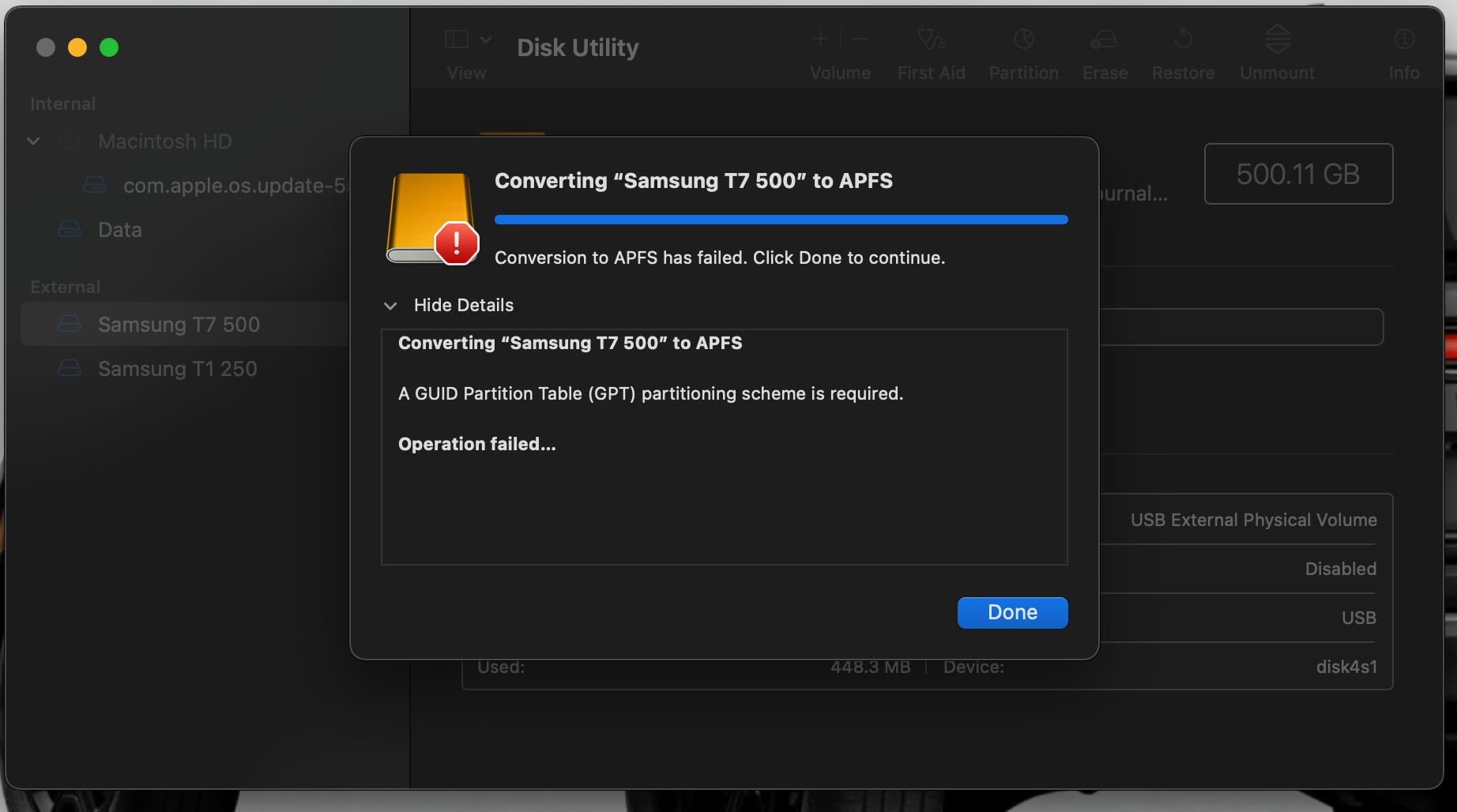 Please help, my new Samsung external SSD, I want to convert it to APFS and encrypt it, but I am running into errors.
