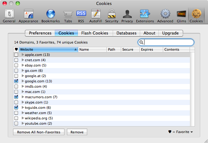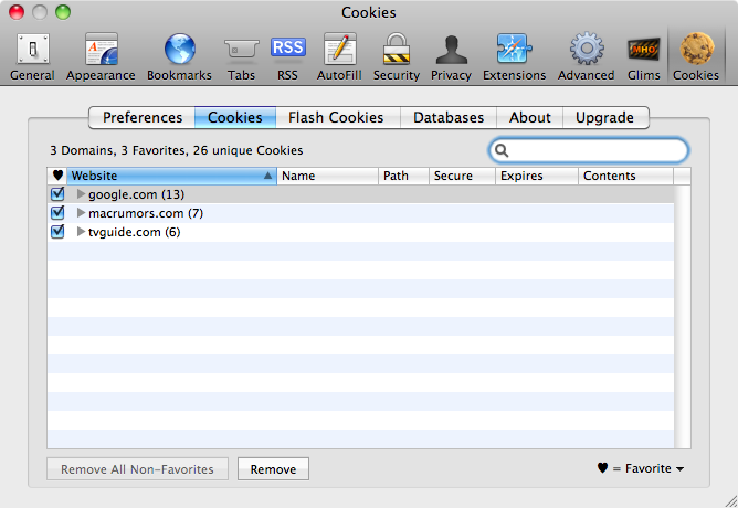 FYI, I have stopped relying on the app, since it doesn't appear to work consistently. I've found that after clearing non-favorite cookies and databases, then closing preferences, then reopening preferences, the cookies reappear. Also, I've noticed that after clearing cookies, I can switch to the Privacy tab of Safari preferences and see that many non-favorite cookies remain. It's clearly not doing what it should be doing. Here are a few screen caps to illustrate: