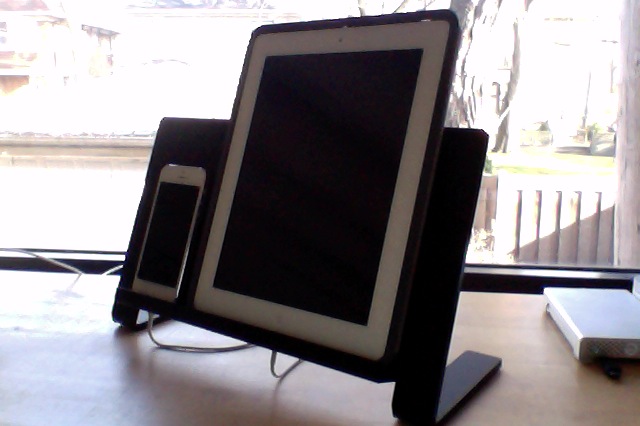 How about this stand? I allows both iPad and iPhone to sit and charge at the same time. It's made of thick acrylic with a matte black surface. There are multiple charger cut-outs to allow various iPad / iPhone orientations.