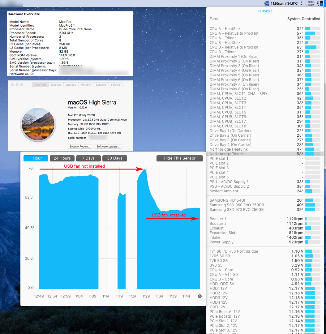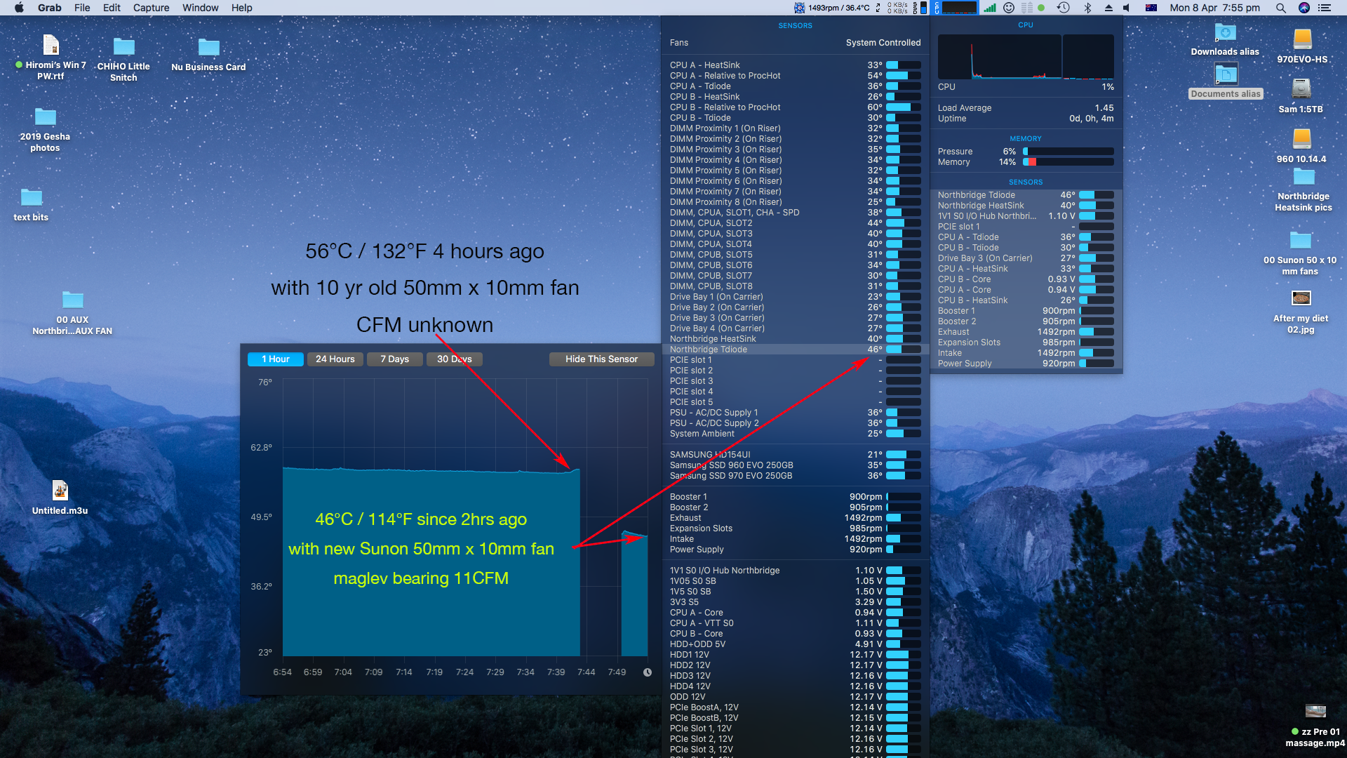 This fan mod apart from dramatically reducing the Northbridge chip temps, contributes to an overall cooler CPU tray area and noticeably lower temps throughout this space.