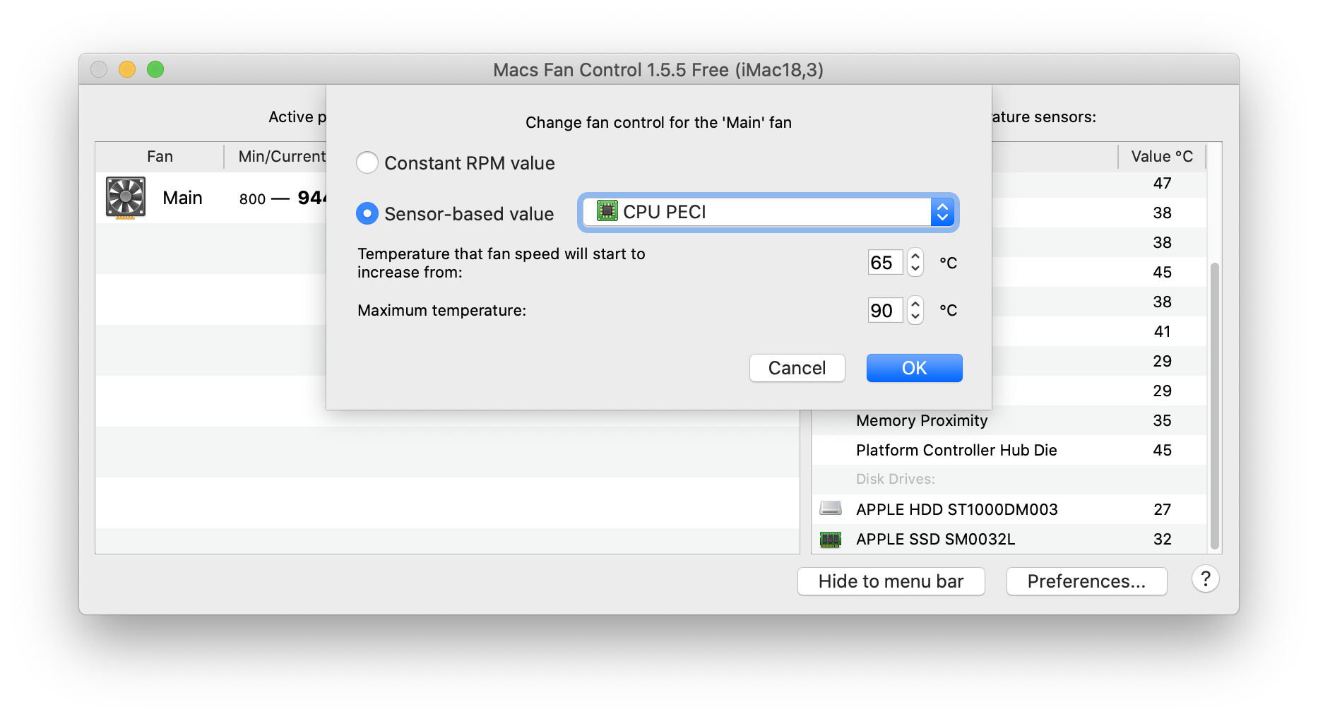 Afterwards, launch (or relaunch) MacsFanControl (it's important to launch or relaunch it after you've modified SMC, otherwise it won't be able to detect the new minimum), set your fan control to manual and adjust the values for start and maximum temperature to your liking. There's a noticeable difference between 1,200 and 950rpm, and it made a huge difference for me.