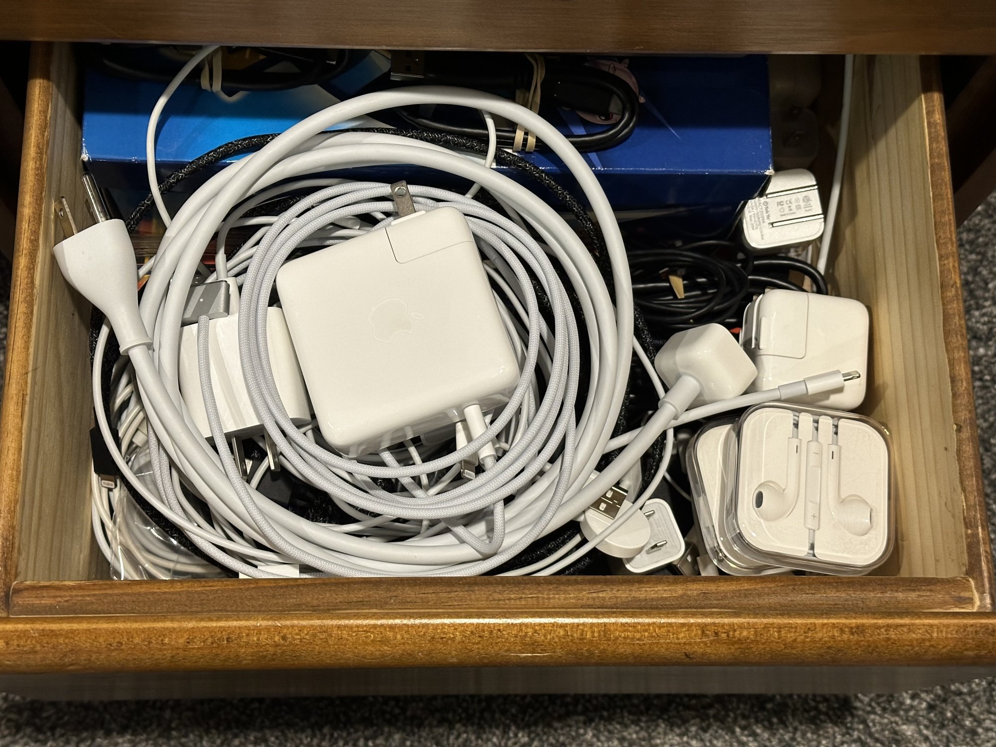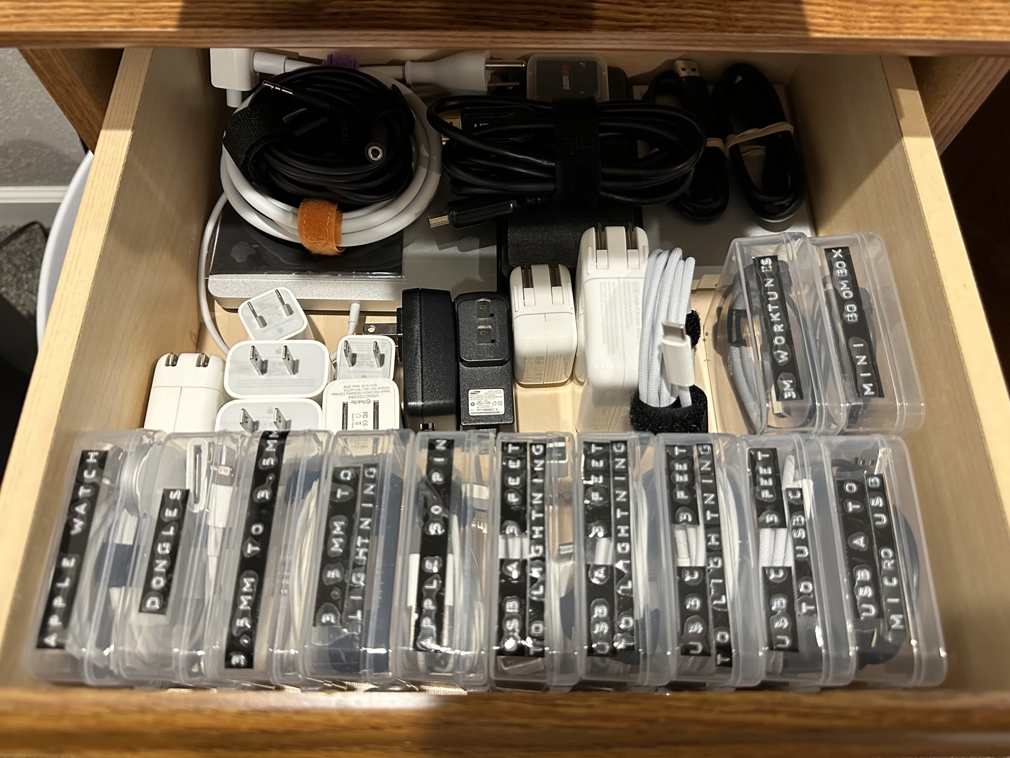 View attachment 2363683Now here is the file cabinet drawer in my office. I think it turned out pretty nice. I have a label maker that was not cooperating but got it to work. I had them all labeled and my label maker tape must be old because I then had to cut packaging tape to put over my labels as they kept falling off. Only thing I didn’t have a box for was my Mac charging cable and I have an Arlo camera box in my closet that has the charging cables for my cameras in it but I think they can stay in the camera box. Towards the back on the right side I have an external hard drive and the two cords on top of it to connect to my Mac. Next to that is two external batteries, on top of those is an hdmi cable along with a micro sd to sd card adapter. Way to the left my cd drive for my Mac which I never use now lol. On top of that an apple polishing cloth that came with my original 2013 MacBook Pro which I no longer have. On top of the cd drive, a 6 foot Mac extension cable and a 3.5 mm to 3.5mm extension cord. I think things turned out pretty nice. Sorry for the delay of posting my results lol.