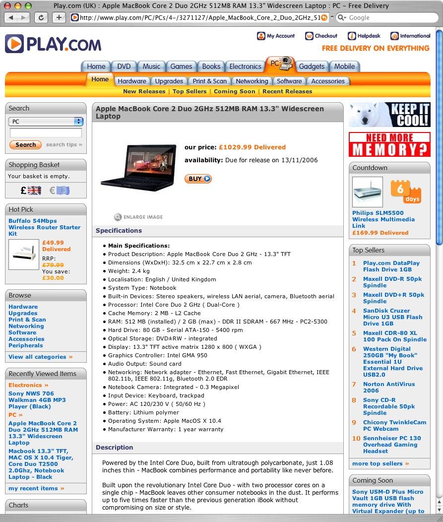 Play.com posts a product listing for a Core 2 Duo MacBook duo for release on November 13th, 2006.