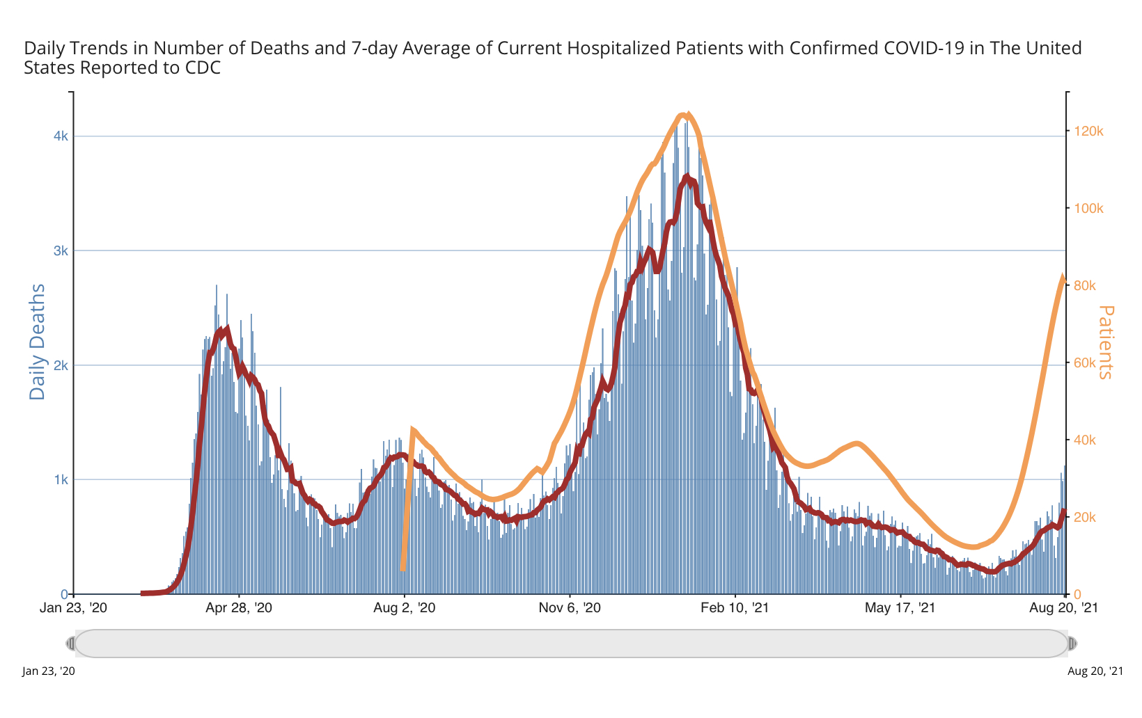 This is an interesting chart from the CDC. It seems to show much fewer deaths from hospitalizations. Or, that hospitalizations and deaths were highly correlated until more recently.
