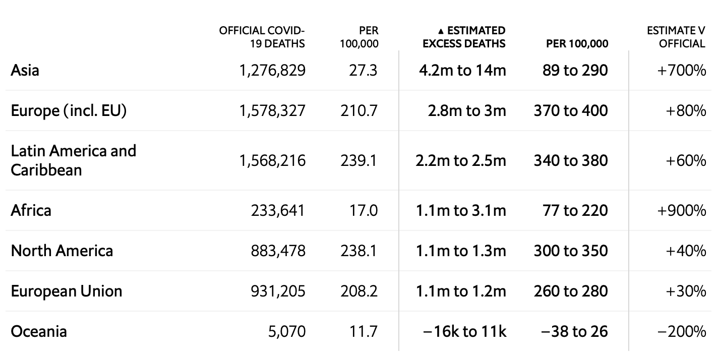 'Excess deaths', as I understand it is based on the historical average of deaths over time. S, for a certain month, statisticians can predict how many people will die, barring any extenuating circumstances, like wars, pandemic, natural disaster. What makes any count of deaths in this country sketchy is that many states either never did release numbers, or at some point stopped reporting their numbers. States like Florida, Ohio, Montana, Wyoming, etc, have either never reported numbers, or have deliberately under-counted the number of deaths. I believe it was Florida that had a spike in flu and other lung diseases at the same point it was saying the deaths due to Covid were declining which made less than zero sense given their past performance. To get a 'real look' at the level of under reported deaths, someone would have to look at all of the reported ways people died, and see if there were spikes in other ways at the same time the Covid was killing so many.