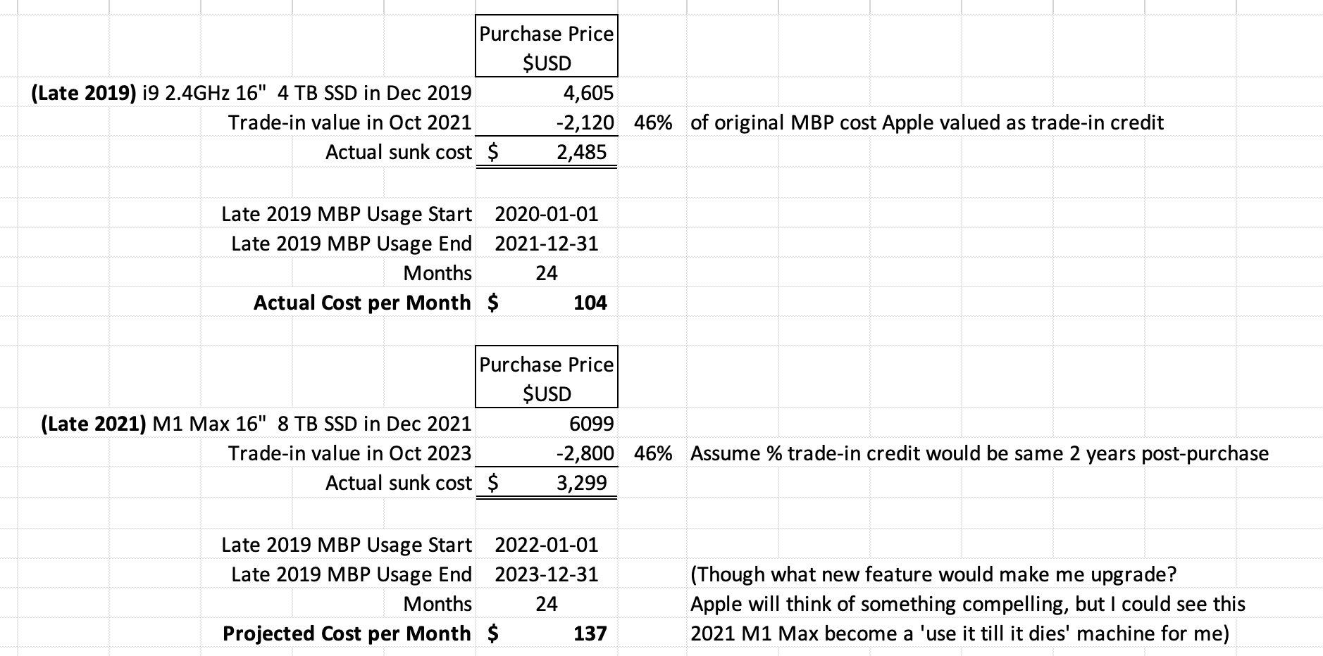 I bought my 13" early 2014 and it worked fine until early 2020, when the 8GB RAM was stopping me from running VMs, which they imposed upon me suddenly and afterwards turned out to be entirely unnecessary. I used it for software development throughout 2015-18. I wanted to get 4 years out of this 16", but we all know how the leafblowerbook pro screwed up that expectation. So I'm hoping to get 5 years out of my new MPB14", at least. If I do that, my average will be moving in the right direction again.