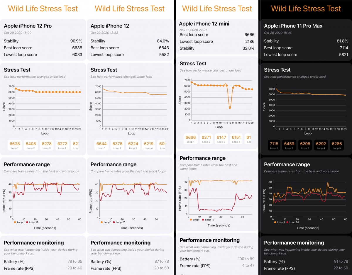 Sustained performance on the iPhone 12 mini is significantly worse compared to iPhone 12 and 12 Pro.